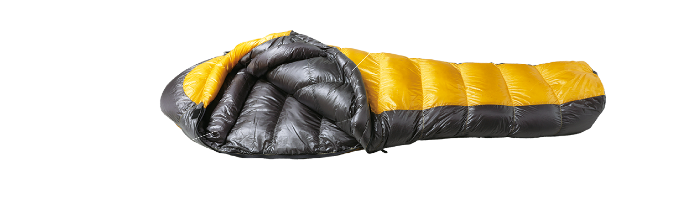 This sleeping bag features a new level of technology, with a trapezoid box baffle structure and solid structure which maximizes the full potential of down, and allows stress-free and efficient heat retention no matter what position you sleep in. By narrowing the feet area, we have successfully reduced weight.