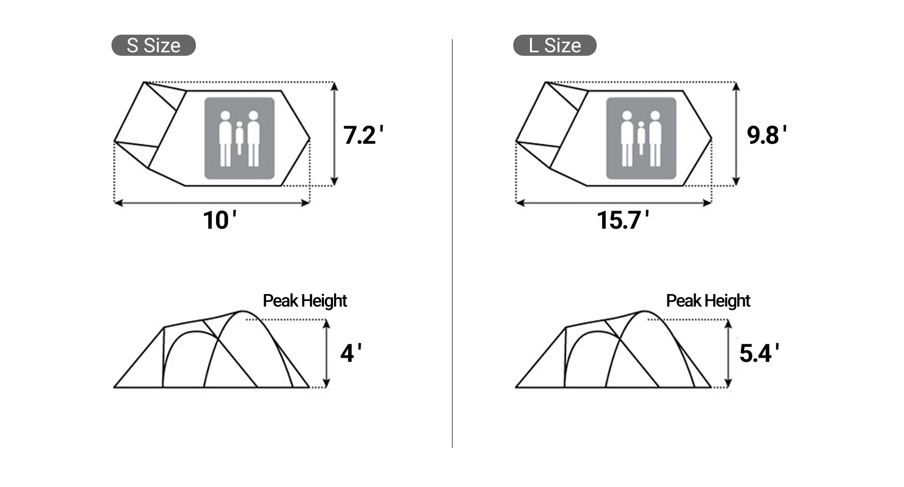 • L Size: 15.7'(L) × 9.8'(W) × 5.4'(H)
