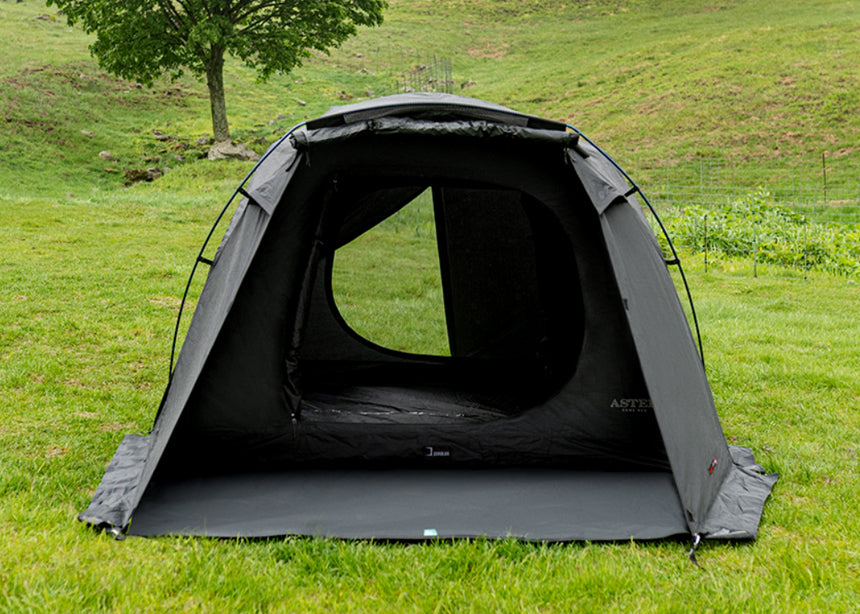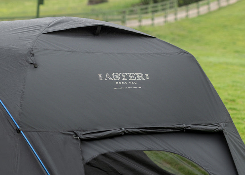 The Aster Dome Neo features a sleek black dome with a quick 3-pole setup, extended ground sheet for extra space and protection, and the Zero-Lux inner system with mesh windows for a comfortable, ventilated camping experience.