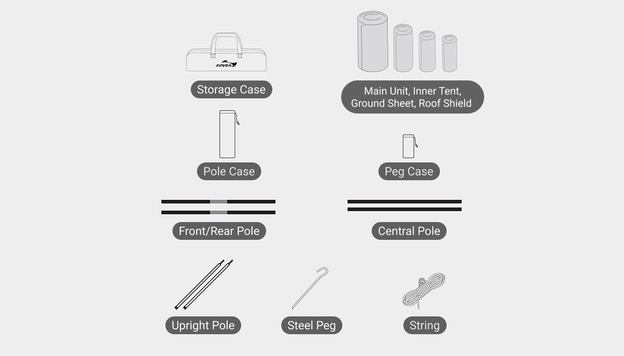 Package Includes: Main Unit * 1, Inner Tent * 1, Roof Shield * 1, Central Pole * 2, Front/Rear Pole * 2, Upright Pole * 2, Ground Sheet * 1, Steel Peg * 24, Guy Line * 14, Storage Case * 1