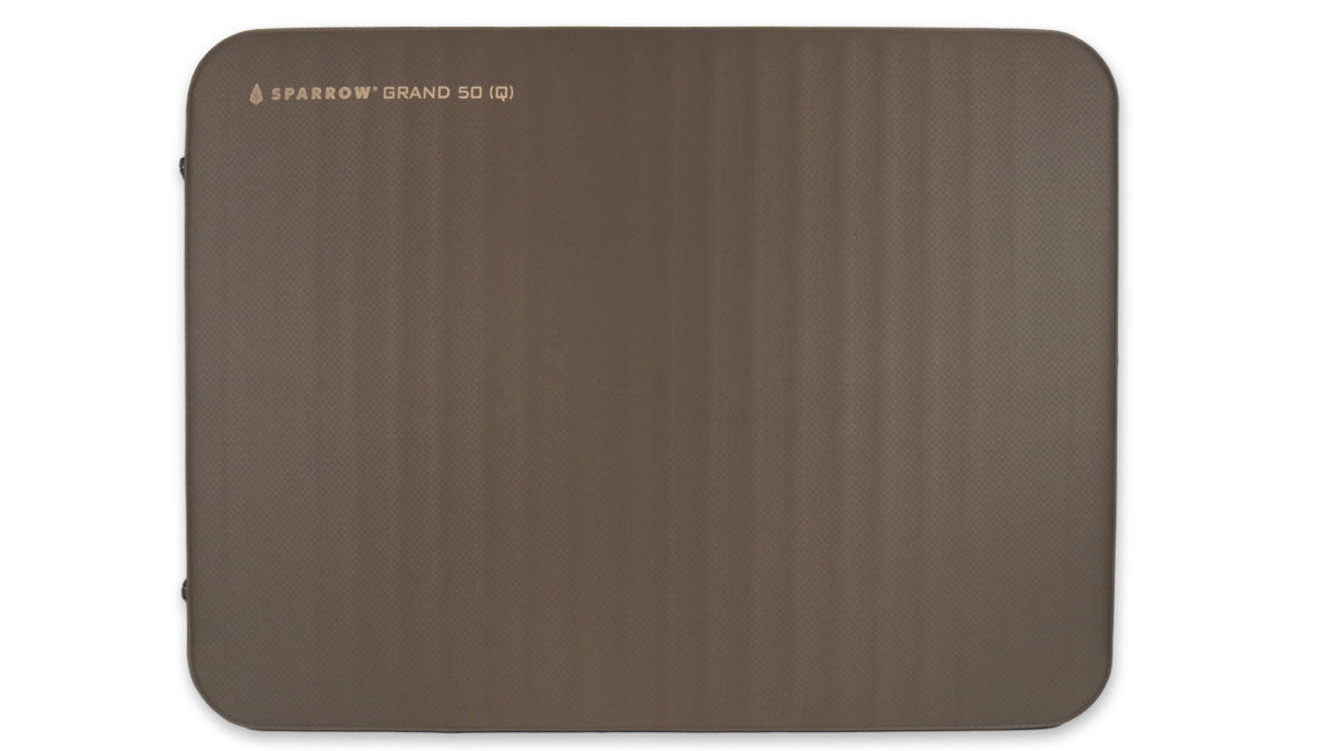 The Grand 50 - Queen is an extra-wide 59"(150cm) outdoor mat with 2.9"(7.5cm) high-density PU foam, 3D sidewalls, TPU coating, non-slip base, and easy roll-up storage, perfect for camping or home use.