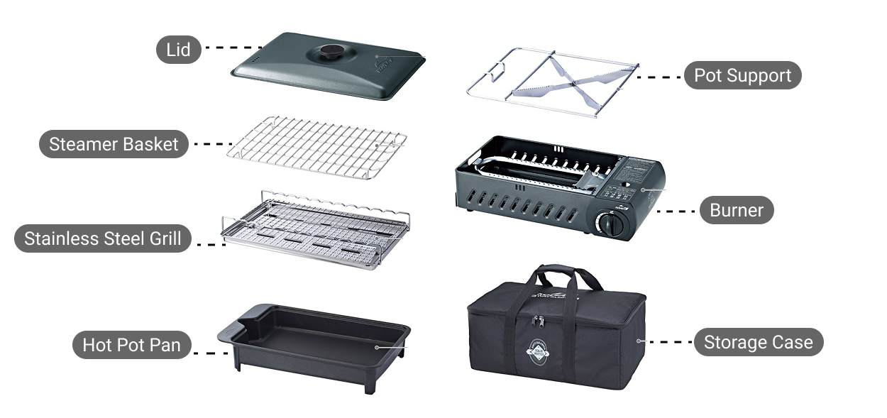 Package Includes: Lid * 1, Steamer Basket * 1, Stainless Steel Grill * 1, Hot Pot Pan * 1, Pot Support * 1, Main Body (Burner) * 1, Storage Case * 1