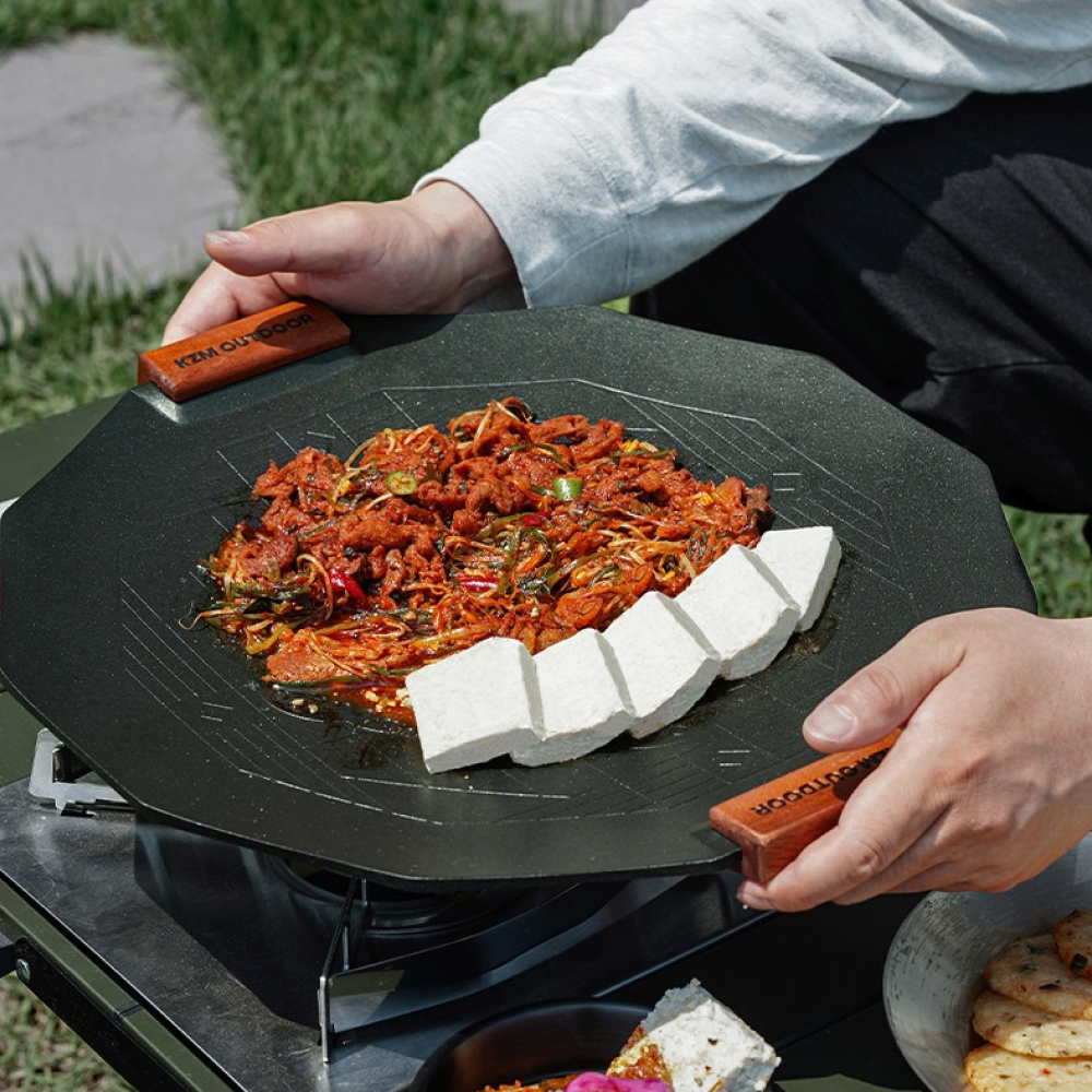 The Ignis Design Griddle Eol is a 12-sided Korean-inspired griddle with a durable Mega Stone coating, thick 5T aluminum construction, wood handles, and a dedicated storage bag for versatile and stylish cooking.