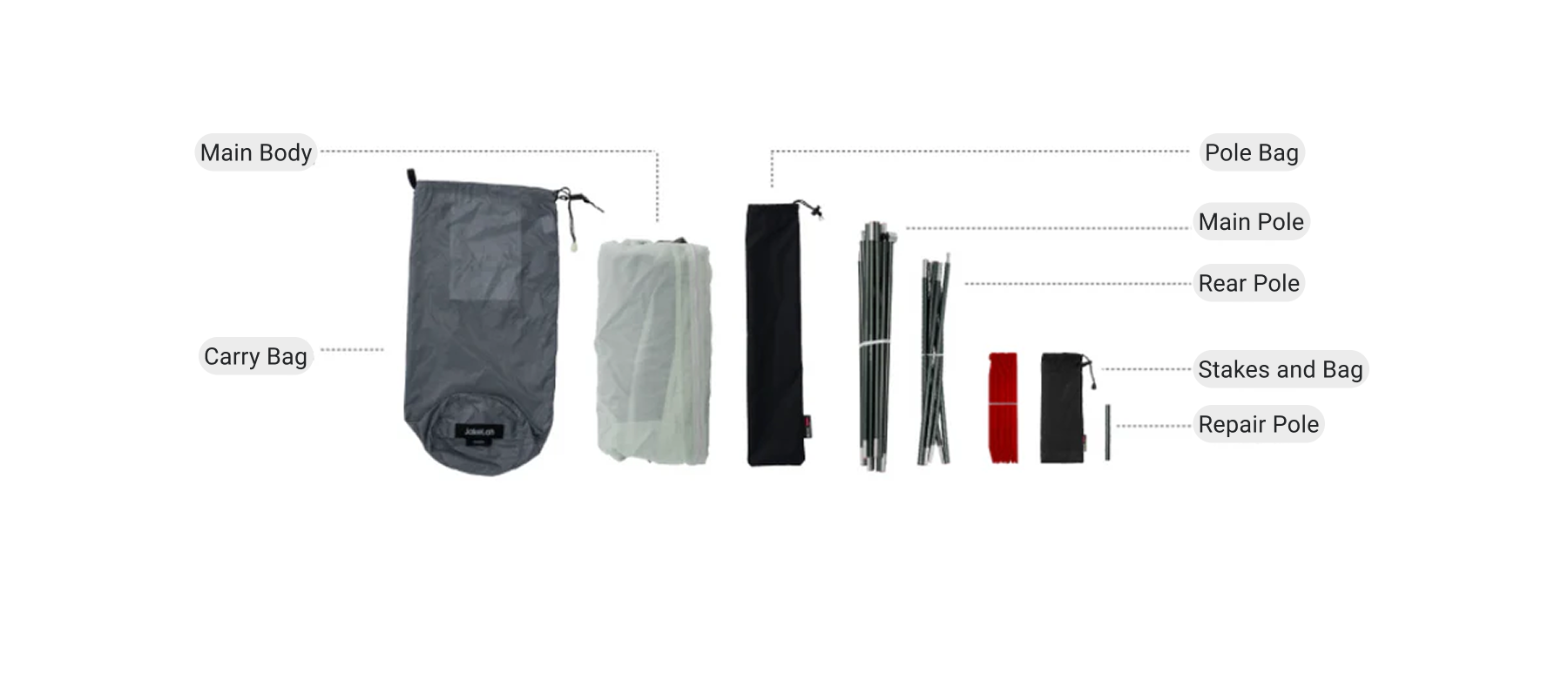 Package includes: Tent Main Body * 1, Carry Bag * 1, Pole Bag * 1, Man Pole * 1 (All connected), Rare Pole * 1 (All connected), Stake * 12, Stake Bag * 1, Repair Pole * 1, Guyline *6