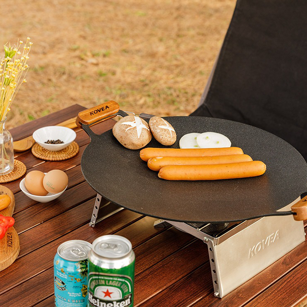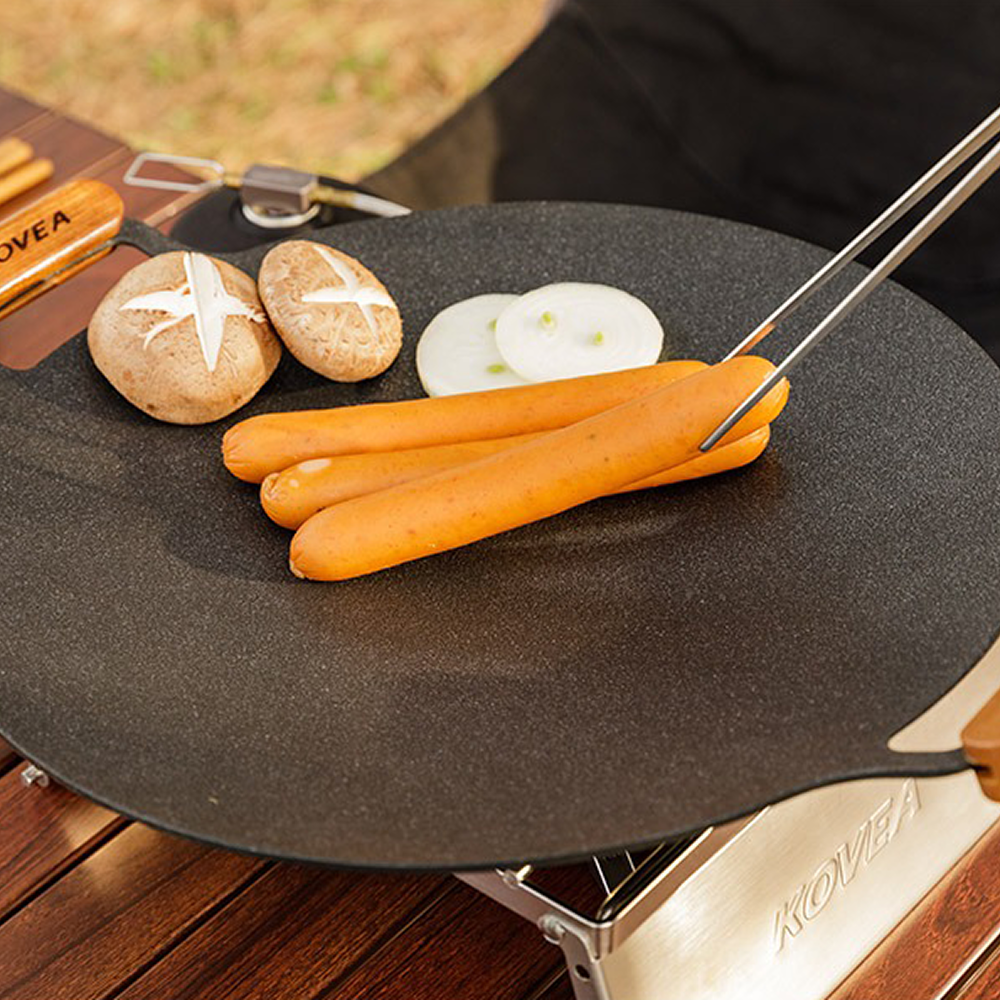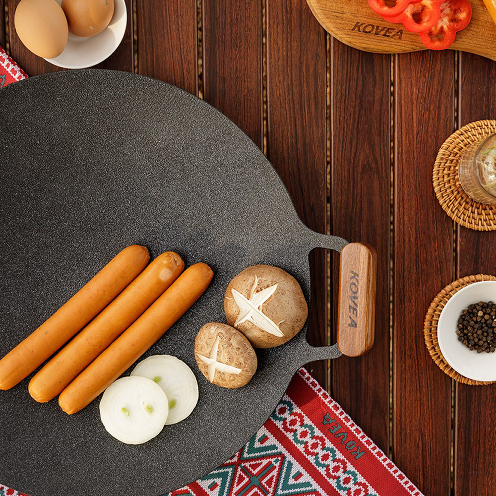 The Prime Round Griddle features a solid cast construction for superior heat conduction and retention, while its premium fluorine nonstick coating ensures effortless cooking with no seasoning required. Compatible with most burners for both indoor and outdoor use, it includes a natural wood handle and protective case for style and convenience.