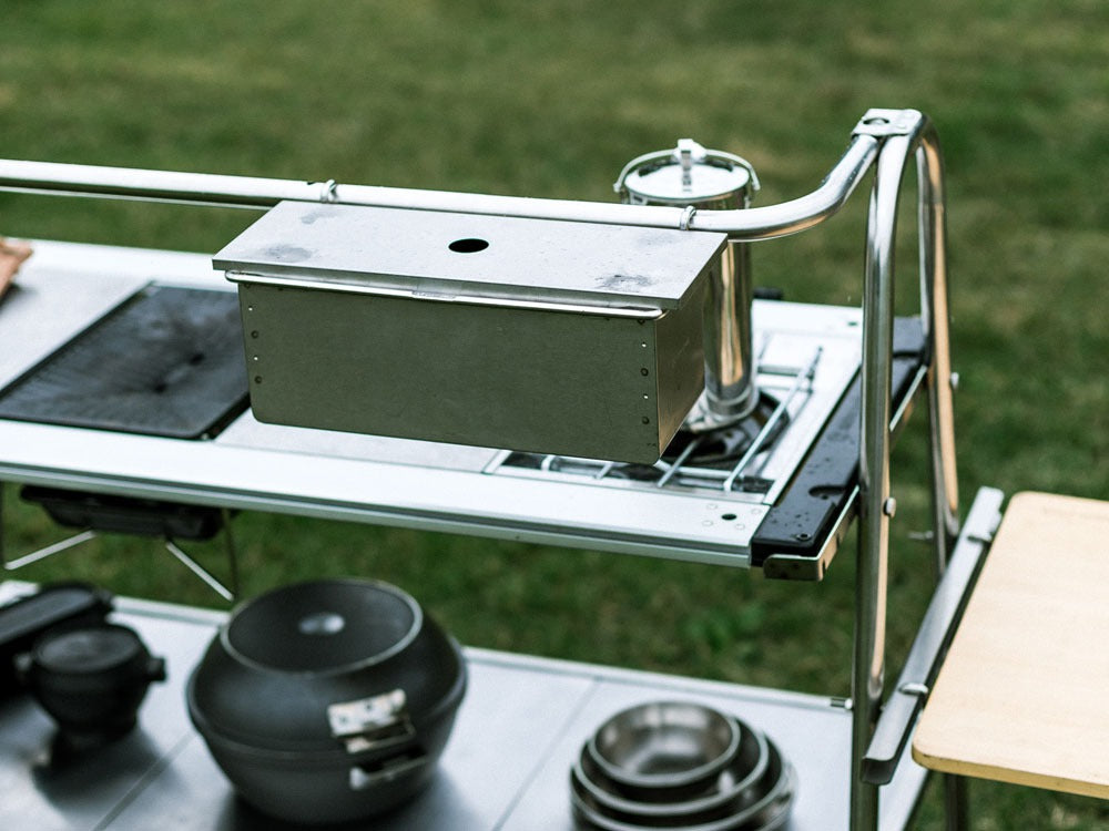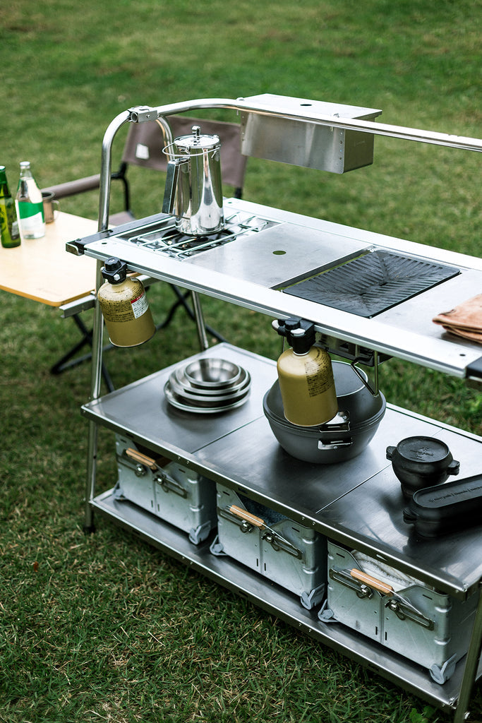 La table de cuisine en acier inoxydable est une étagère modulaire robuste de conception japonaise.