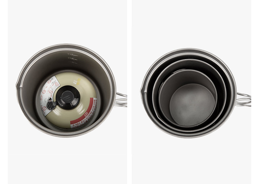 The Titanium Cooker 950 uses a nesting design, allowing for compact storage and convenient packing wherever your outdoor adventures take you.