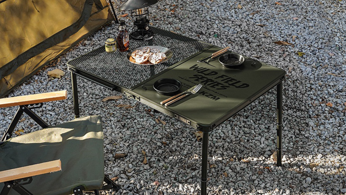 The Wild Field 2-Folding Table combines a stylish olive khaki iron mesh with a rugged Field Series tabletop design. The aluminum frame provides sturdy support, and the folding section features a lock for easy securing, making it versatile and convenient for use anywhere.