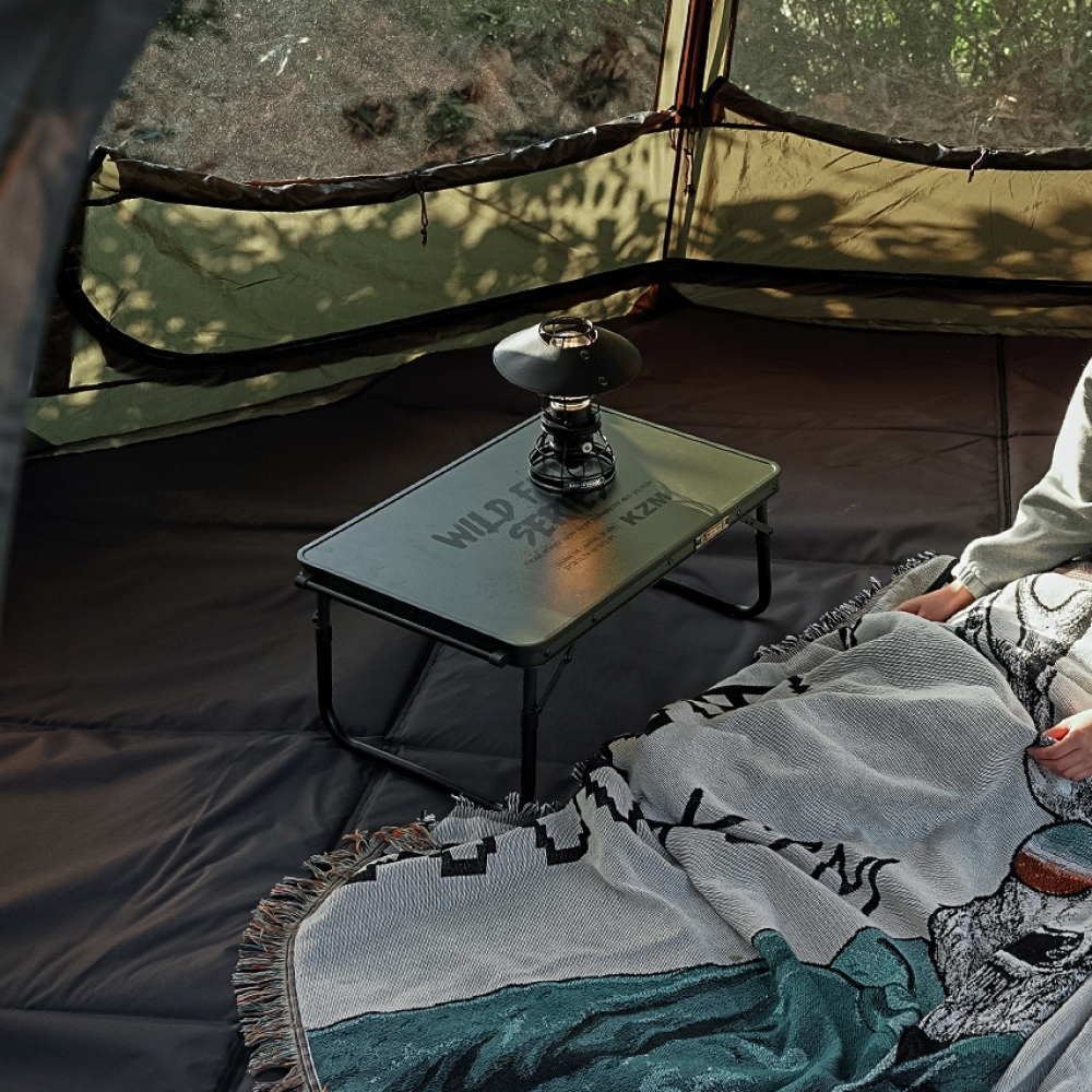The Wild Field Ground Table - Mini combines a stylish olive khaki iron mesh with a rugged Field Series tabletop design. Made from aluminum and steel, it’s compact yet highly durable, and its easy assembly makes it a convenient camping mini table for use anywhere.