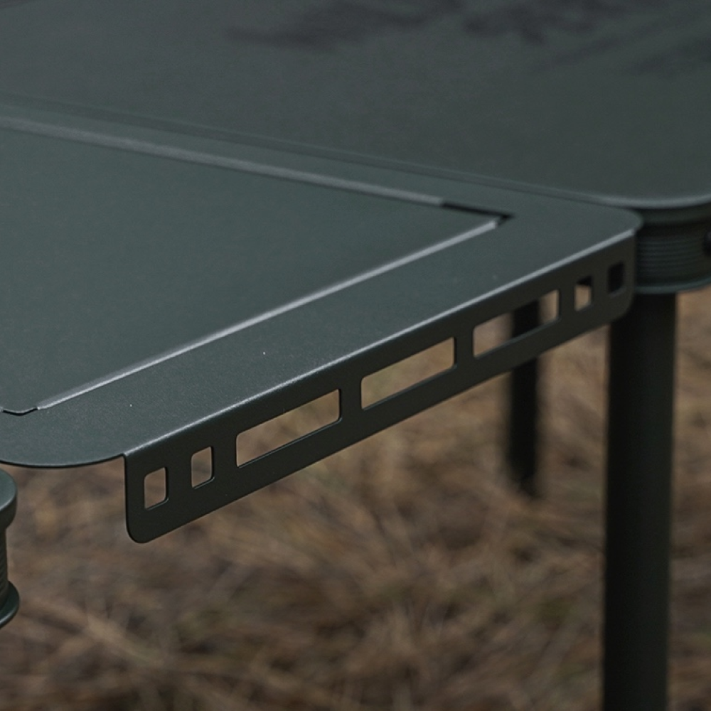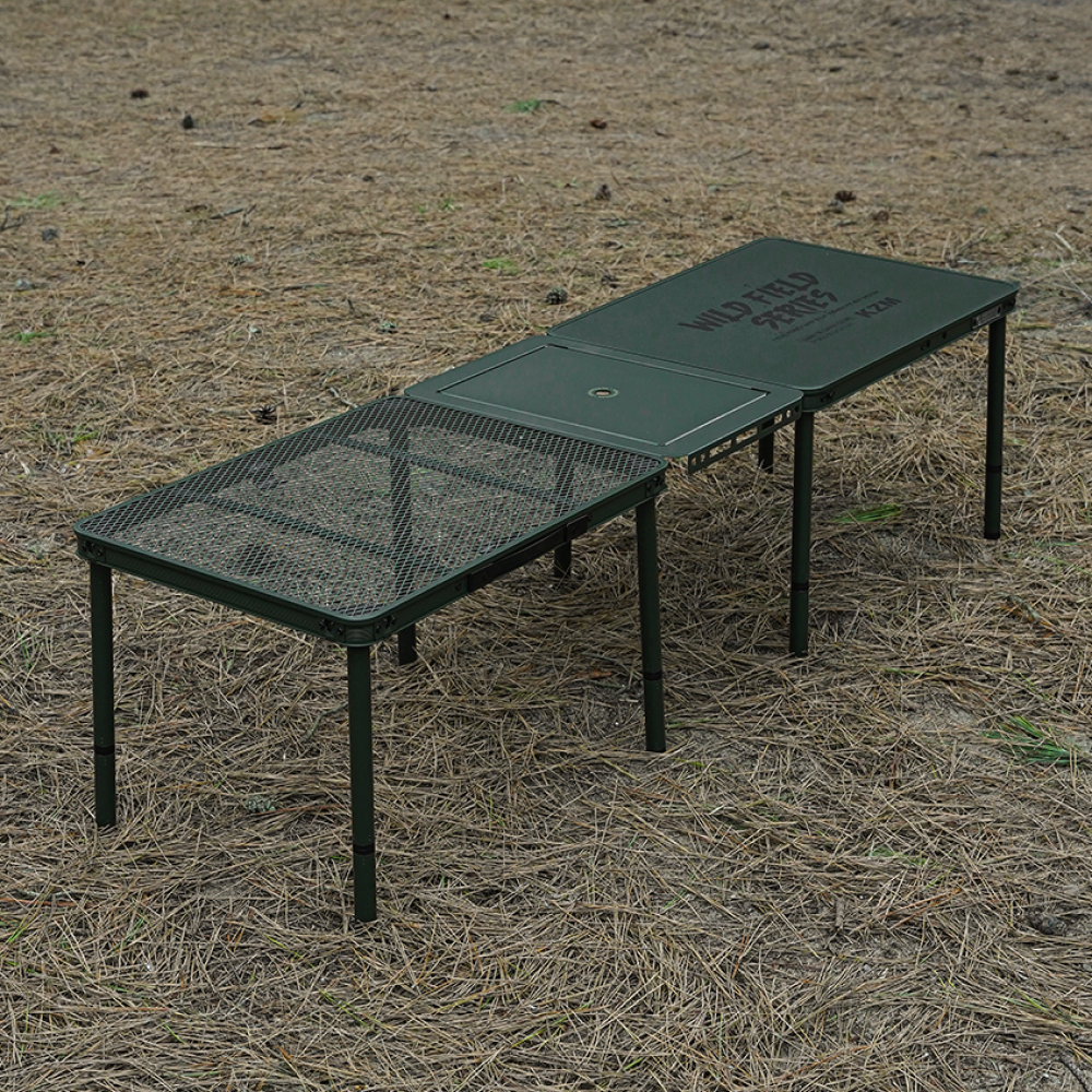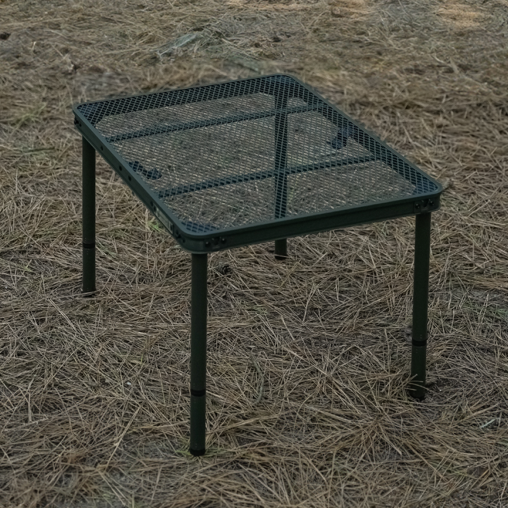 The Iron Mesh & MDF Table is a durable, lightweight camping table with adjustable height, detachable design, and versatile cooking and hanging options, combining rugged style with practical functionality.