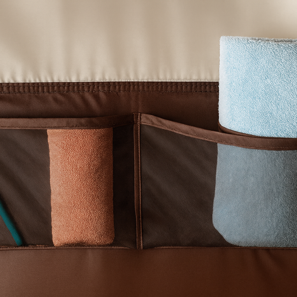 Equipped with a Velcro strap for hanging a shower head, mesh storage pockets, and a towel holder, it adds practical convenience to your outdoor setup.