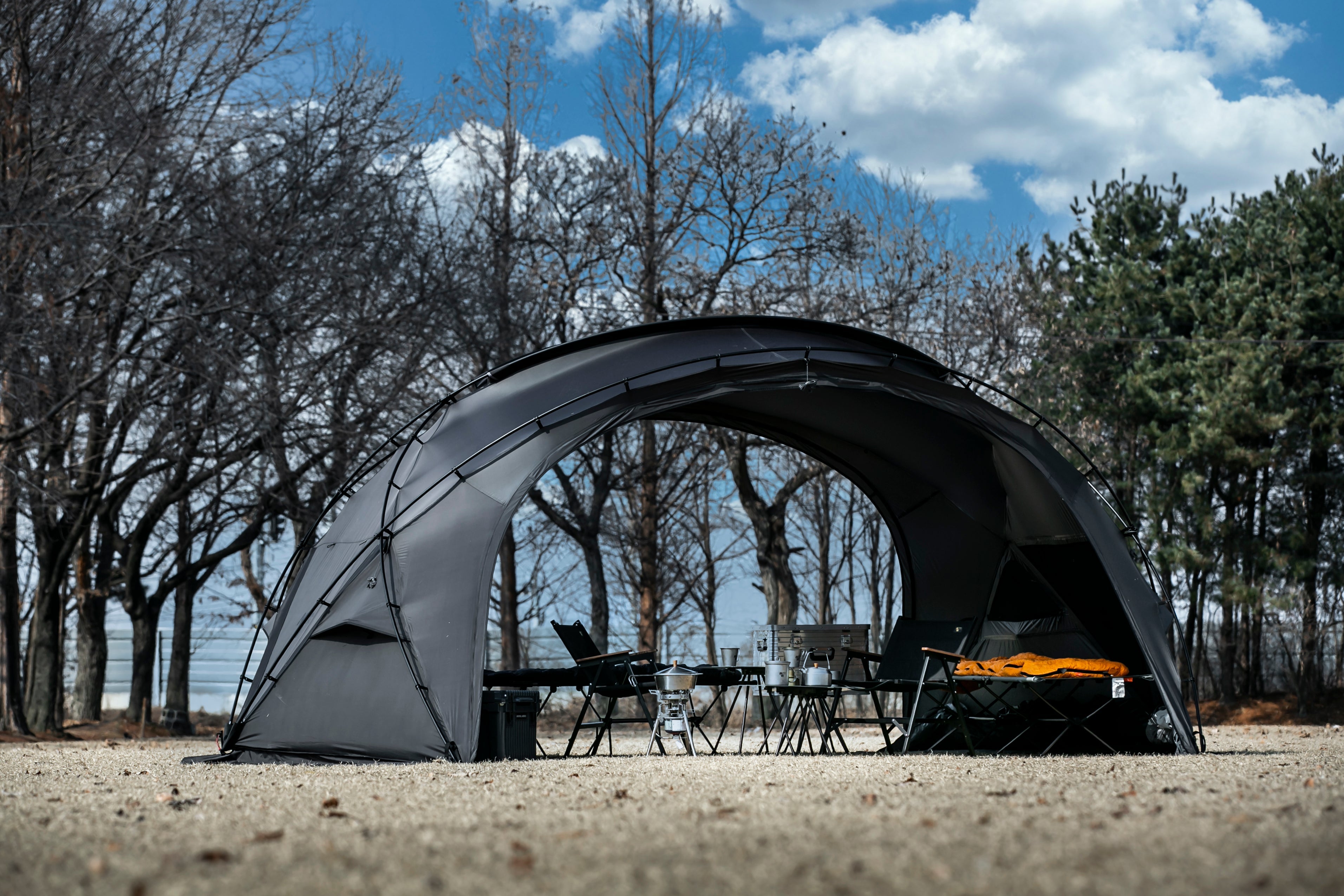 MinimalWorks Agora Vestibule is exclusively designed for the Agora shelter. When combined, it creates a separate front room that can be used for storage or simple cooking, expanding the shelter’s functionality beyond the main tent area.