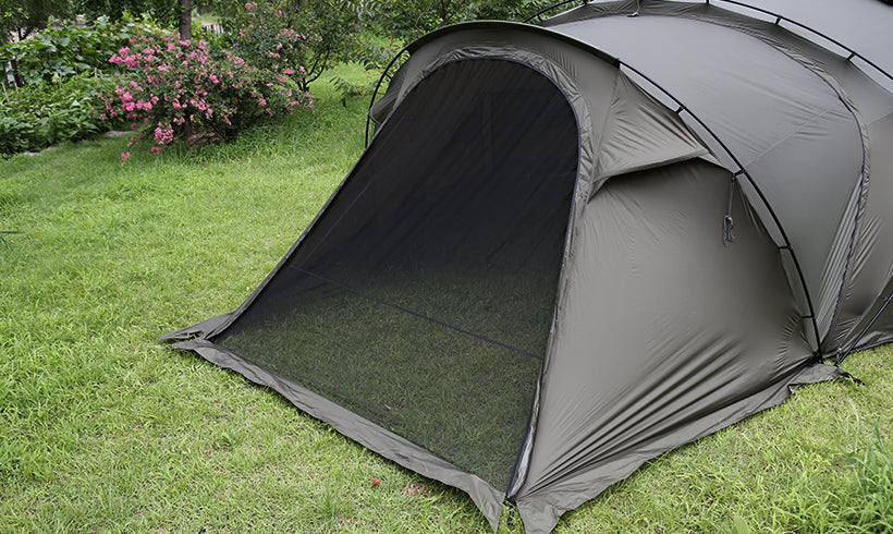 The mesh door easily attaches via zipper for simple setup. It keeps insects out while promoting air circulation, maintaining a clean and breathable space inside.