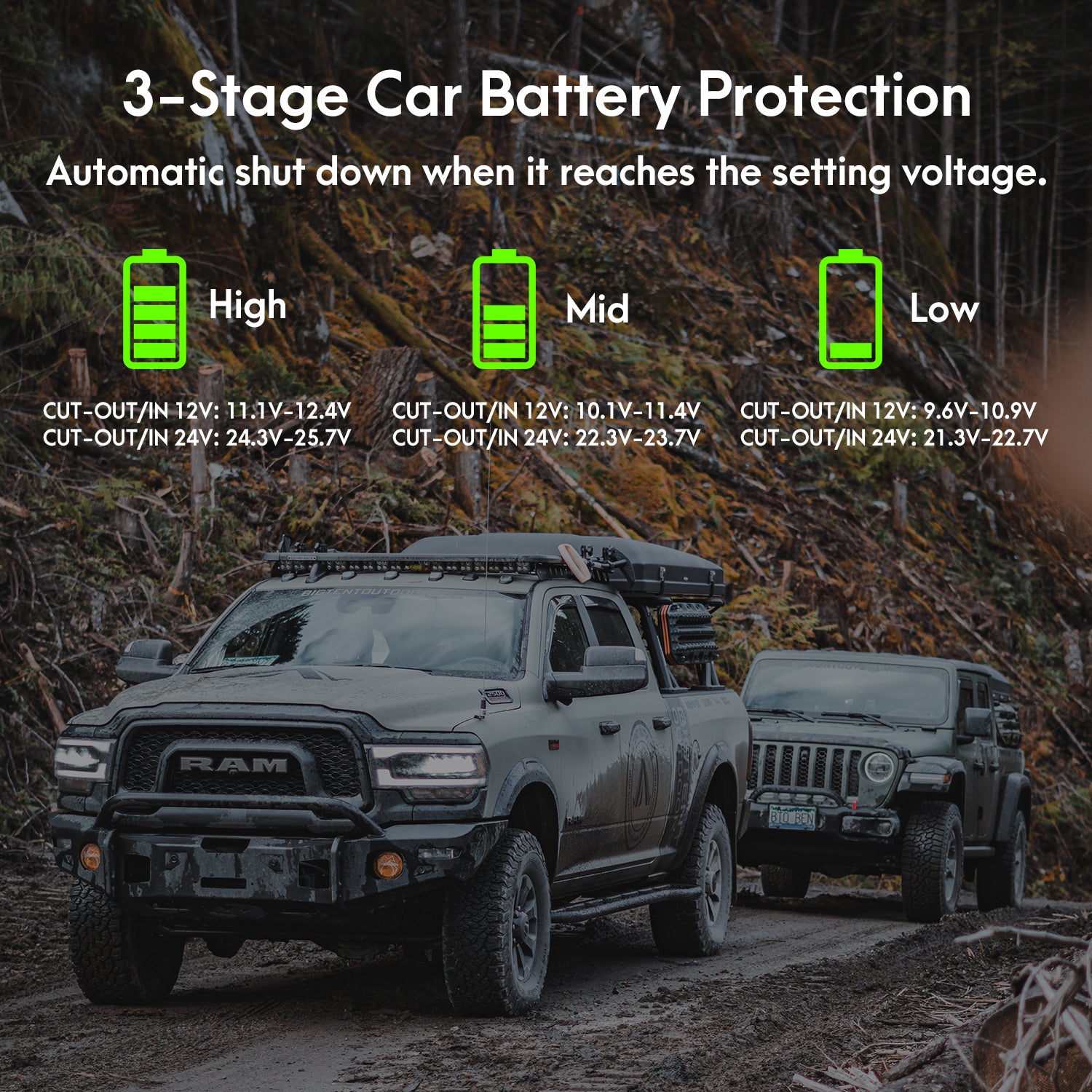 3 Stage (Low, Mid, High) Dynamic Battery Protection System automatically shuts the fridge off to prevent a dead car battery and improves car battery performance.
