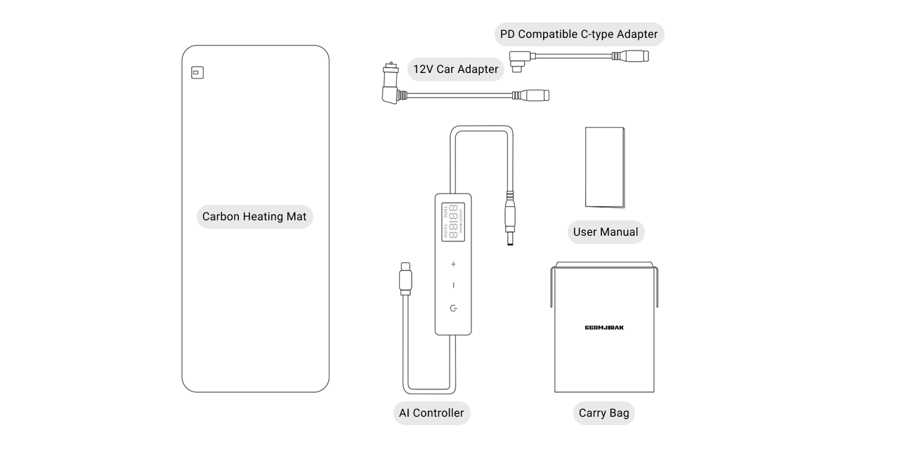 Default package includes: Carbon Heating Pad *1, AI Controller *1, 12V Car Adapter *1, PD Compatible C-type Adapter *1, Carry Bag *1, User Manual *1