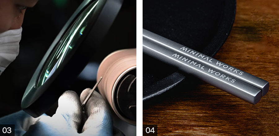 MinimalWorks Chopsticks T, created in collaboration with world-renowned eyewear brand Katsuki, is crafted from 99.5% pure titanium for lightweight durability. Shorter than standard chopsticks, it is easy to carry outdoors and comes with a chopstick rest and a dedicated case for added convenience.