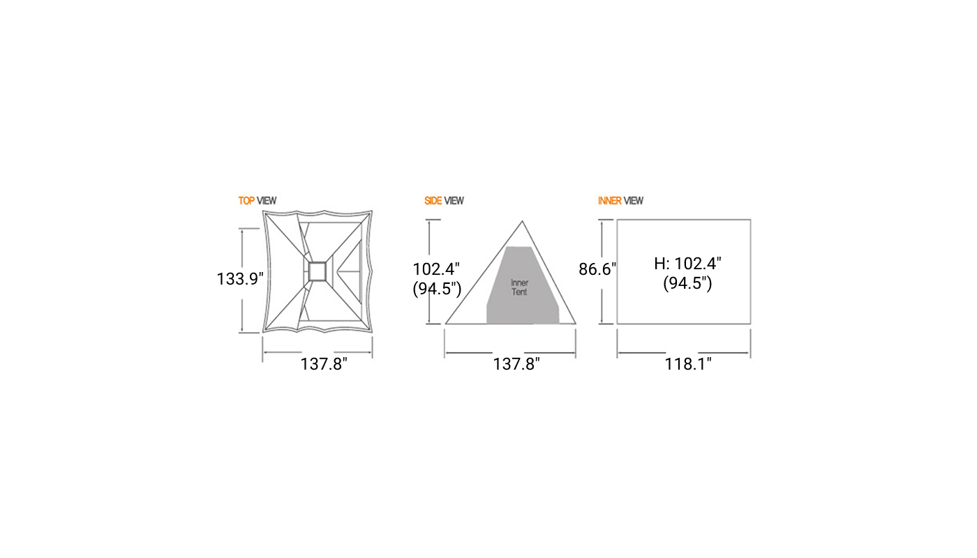 • Inner Tent: 118.1"(W) × 86.6"(D) × 102.4"(94.5")(H)
