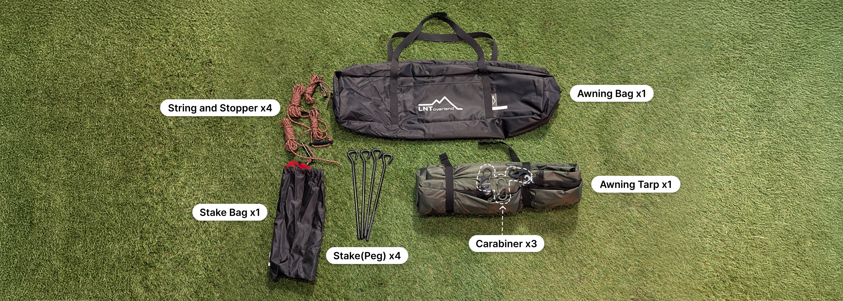 Awning skin, Carry bag, Peg 4pcs, Peg bag, Awning rope 4pcs, Rope tensioner 4pcs, Carabiner 3pcs