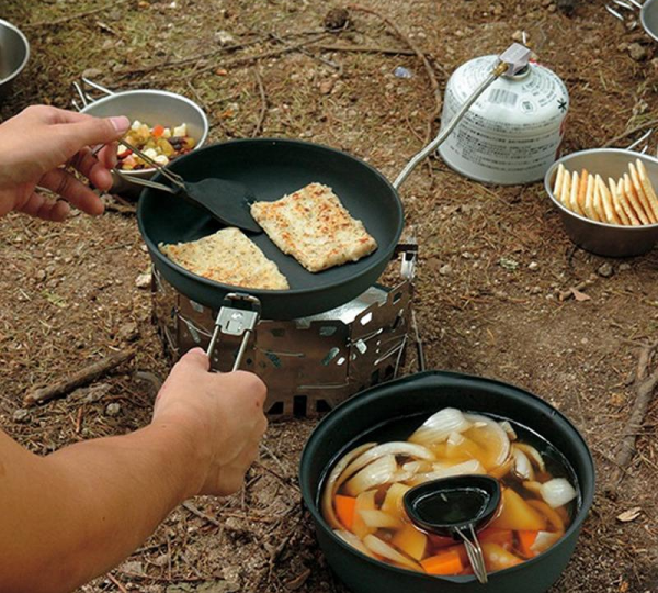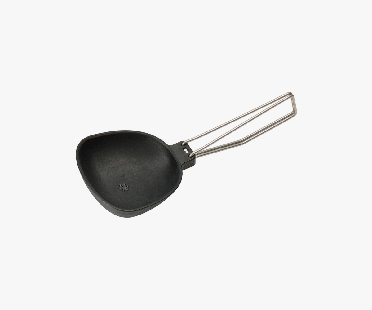 This collapsible ladle is designed with a nylon head to prevent scratching non-stick surfaces and features a fold-away handle for compact storage. It is developed for outdoor cooking environments and manufactured in Japan to ensure reliable build quality.