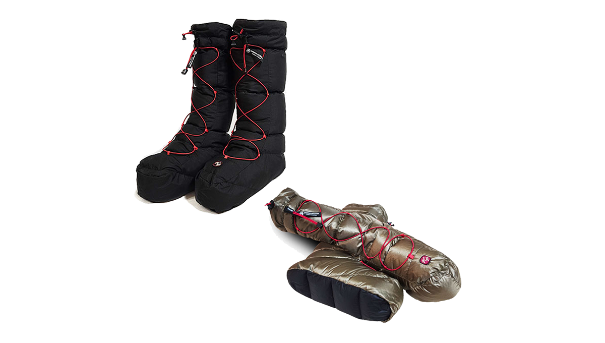 The Premium Goose Down Tent Shoes feature a 90/10 goose down fill and Pertex Quantum shell, offering exceptional warmth and breathability even in freezing conditions.