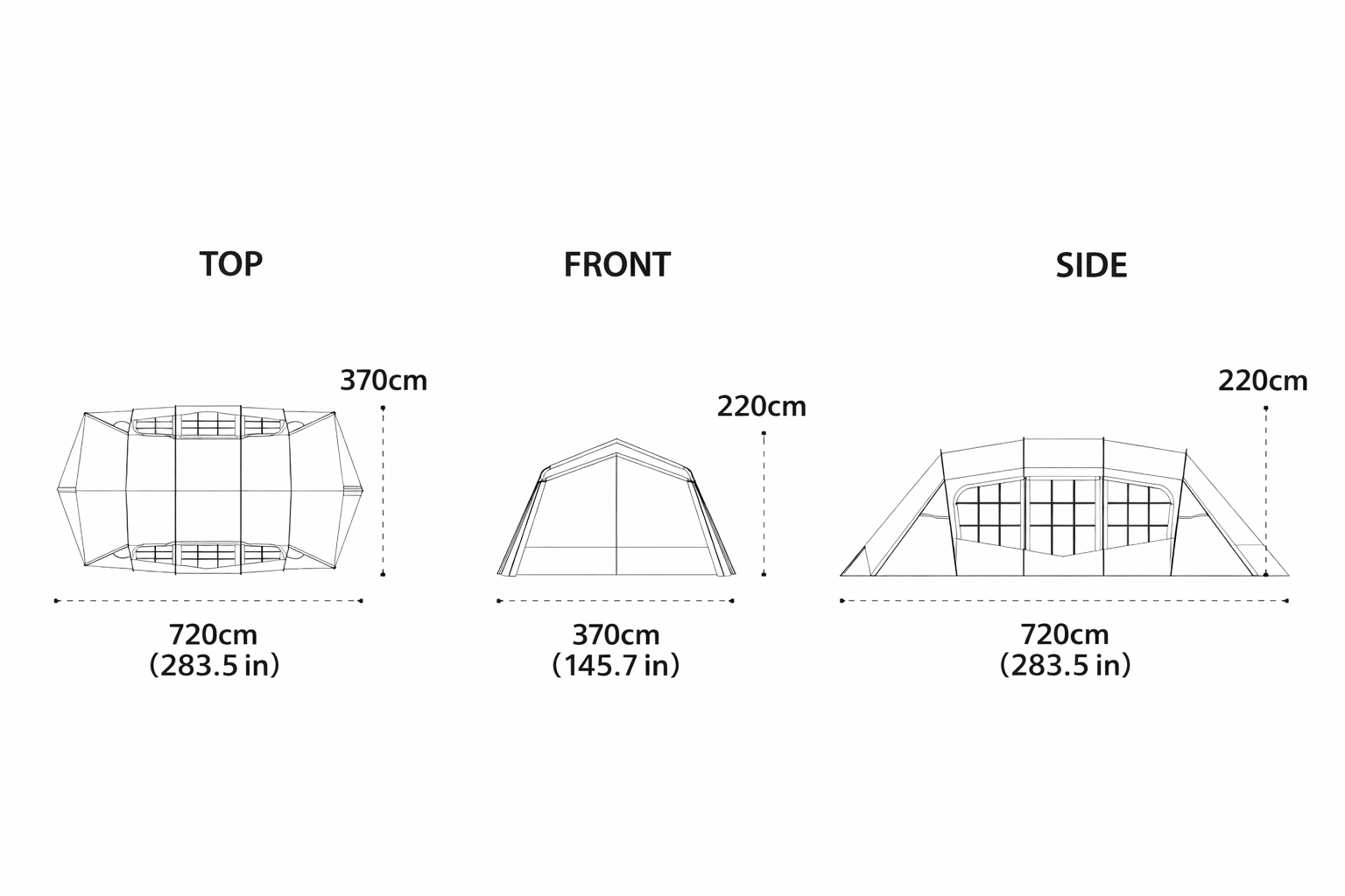 • Set Up Size (Overall Tent): 283.5 × 145.7 × 86.6 in (L × W × H) (720 × 370 × 220 cm)