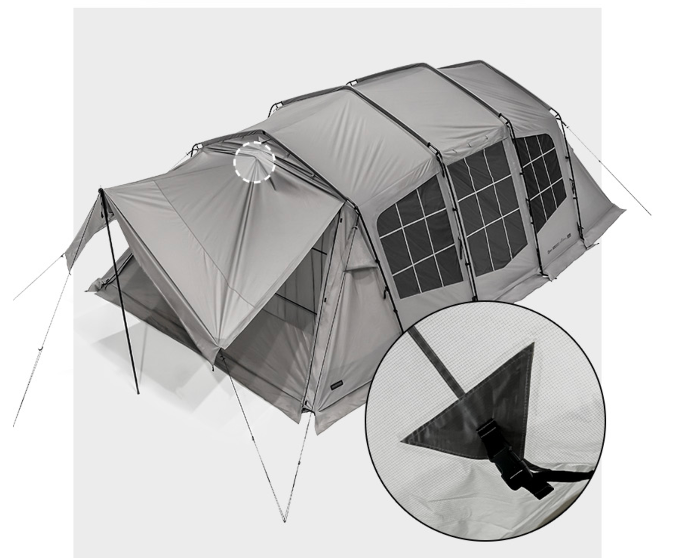 The Grandio House Tent is designed for campers who want real living space, not just a place to sleep. Its fully liftable front and rear panels open up the tent to create a wide, airy shelter that feels closer to a cabin than a tent. An adjustable lift pole system keeps the structure taut, even as temperature and humidity change.