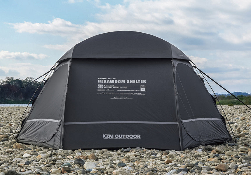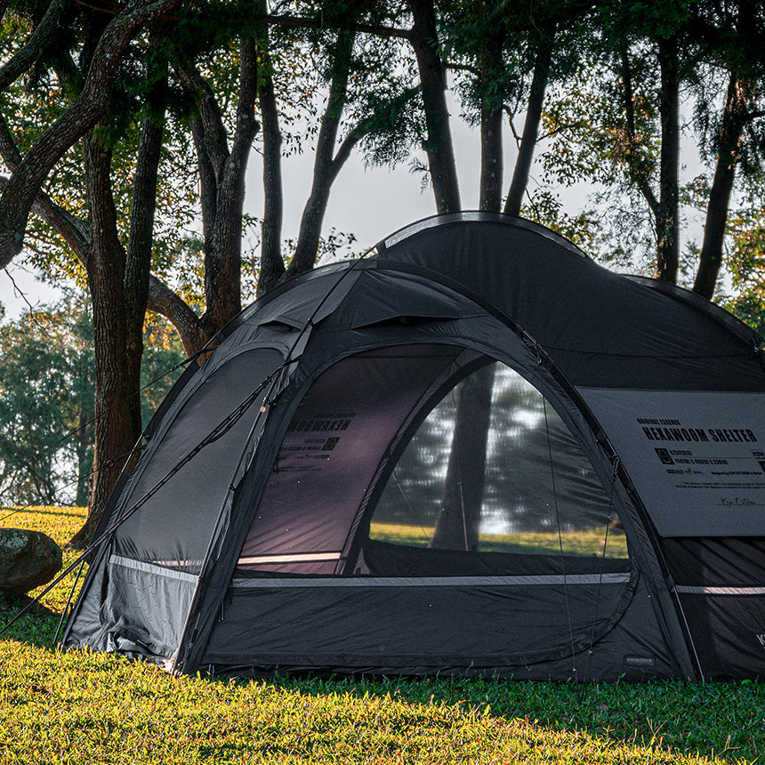 Hexaum Shelter features a unique hexagonal design with four large doors for wide-open views and a spacious interior. Quick three-pole setup and weather-ready construction keep you comfortable outdoors.