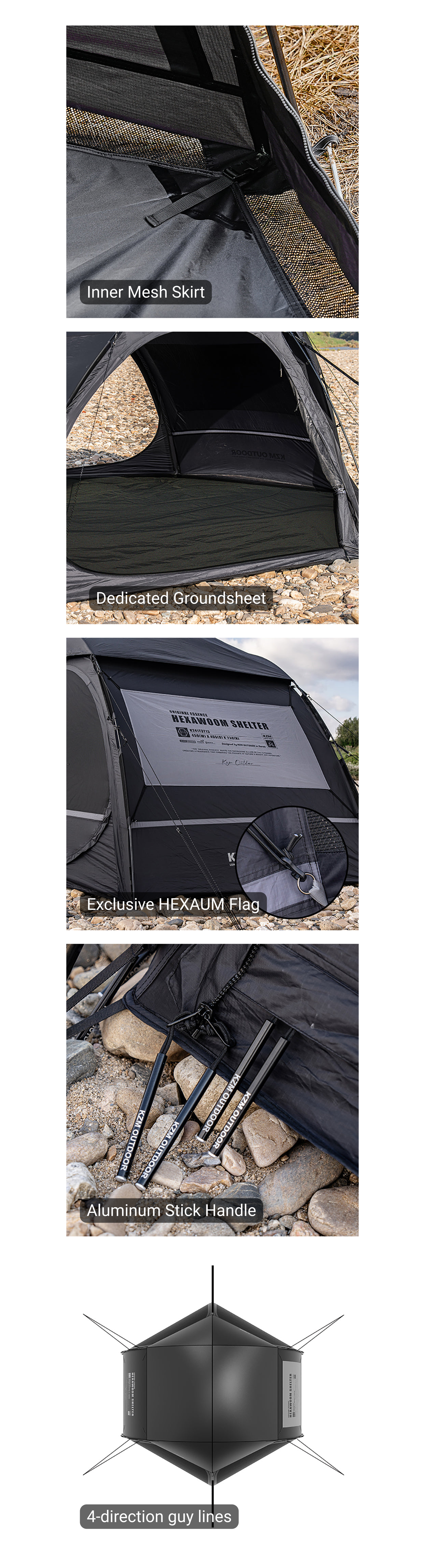 Hexaum Shelter offers stability, style, and year-round usability with its non-regular hexagonal structure and durable 75D ripstop fabric. Large mesh windows improve airflow while keeping insects out, and the 3,000mm waterproof roof with Teflon coating ensures weather protection. The easy pole-cap system allows quick setup, and the optional Hexaum Shelter Double TPU (sold separately) provides a clear view even with doors closed.