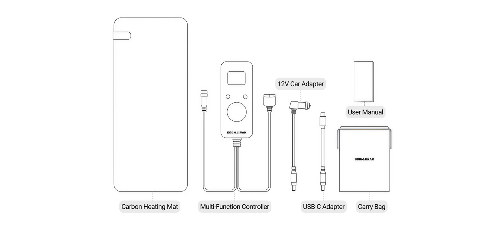 Default package includes: Carbon Heating Pad *1, Multi-Function Controller *1, 12V Car Adapter *1, USB-C Adapter *1, Carry Bag *1, User Manual *1