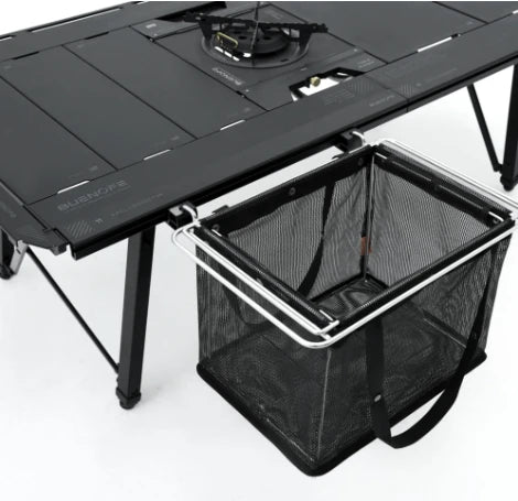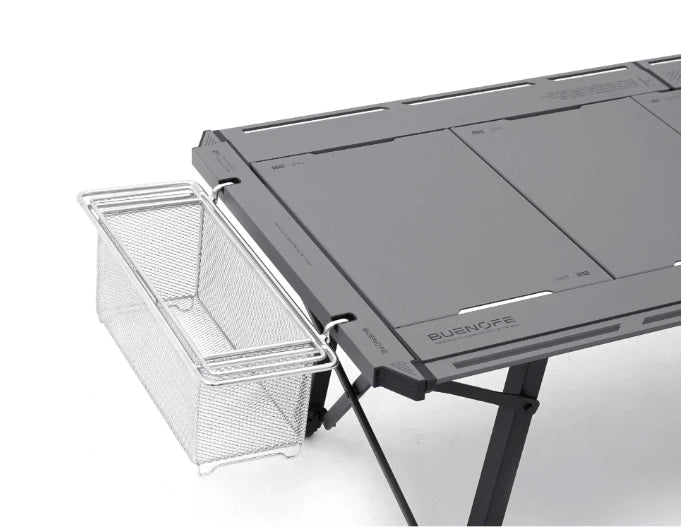 Solves the problem of limited tabletop area by relocating prep trays or storage units to the exterior of the frame.