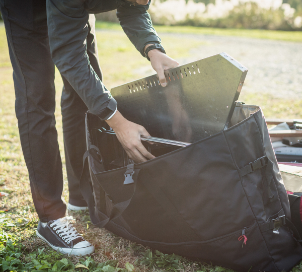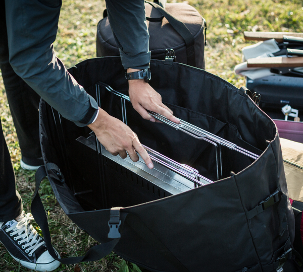 The Snow Peak Jikaro Carrying Case is made of reinforced nylon and is designed to securely store and transport the Jikaro Table. It includes both internal and external pockets for additional storage and works with extension legs and grill accessories.