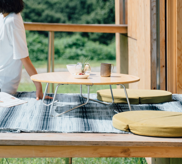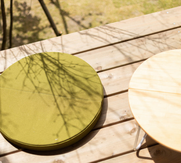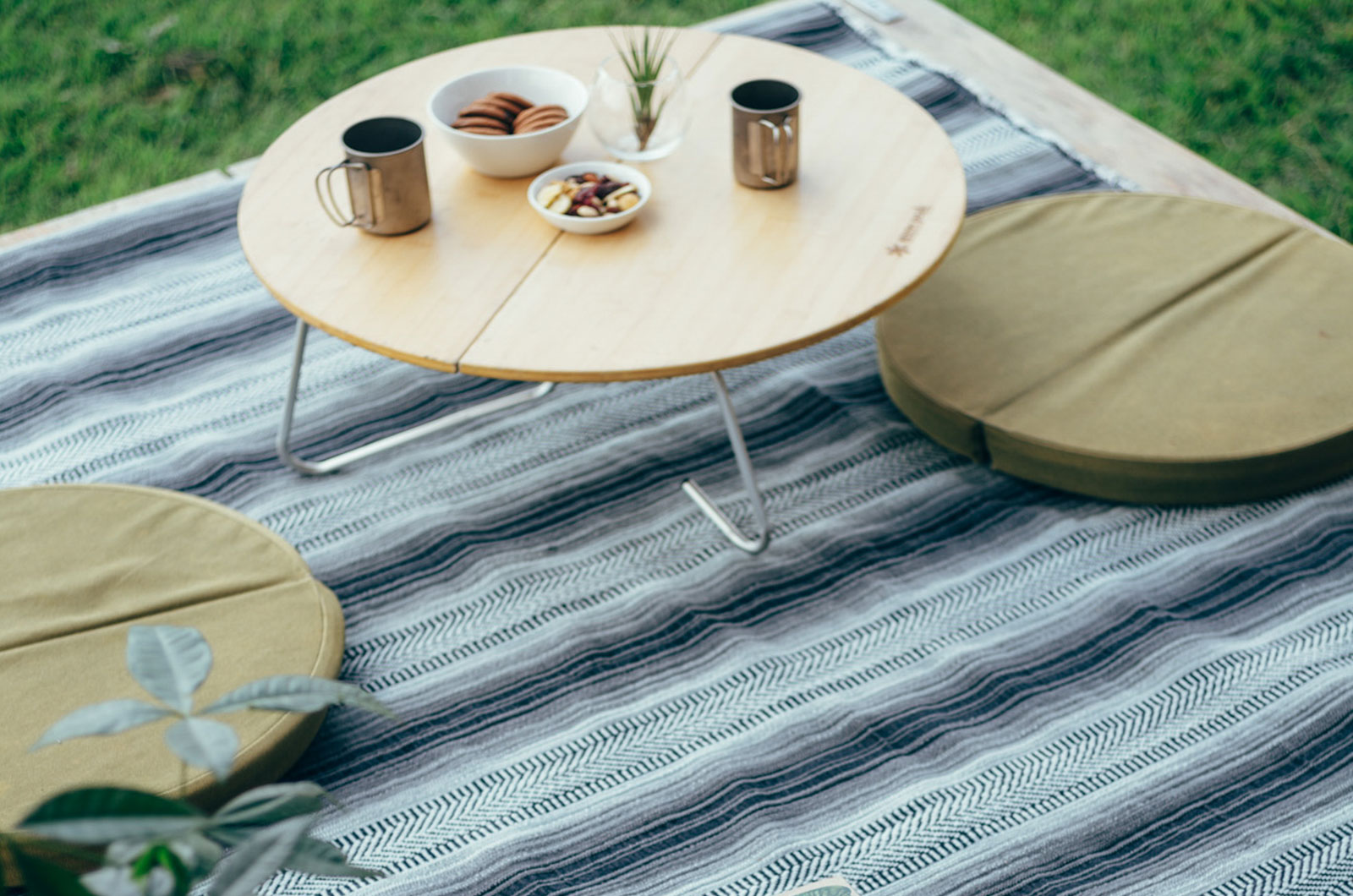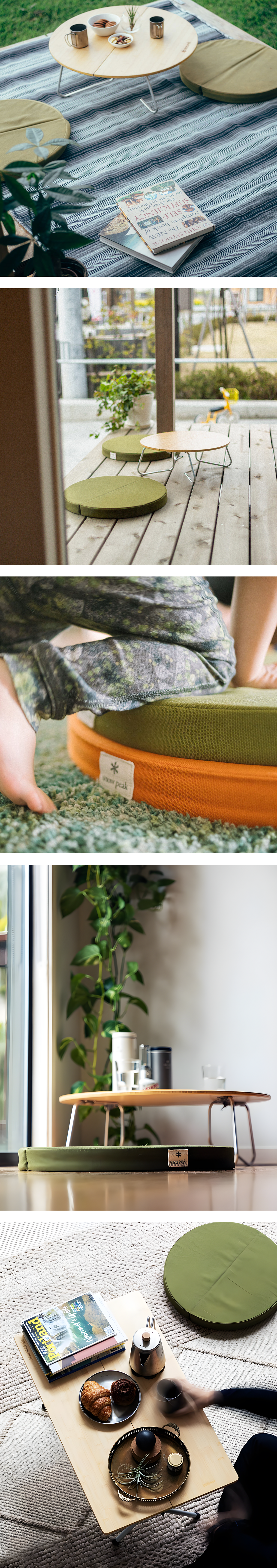 The Lounge Cushion is a Japanese-designed ground seat suitable for indoor or outdoor use, especially for campfields or patios. It folds in half to provide a slightly elevated seating height while allowing compact storage.