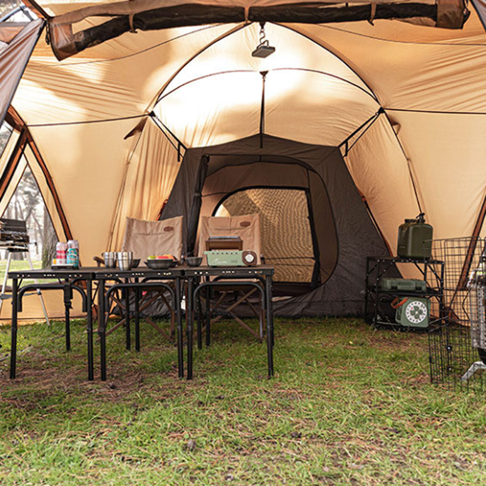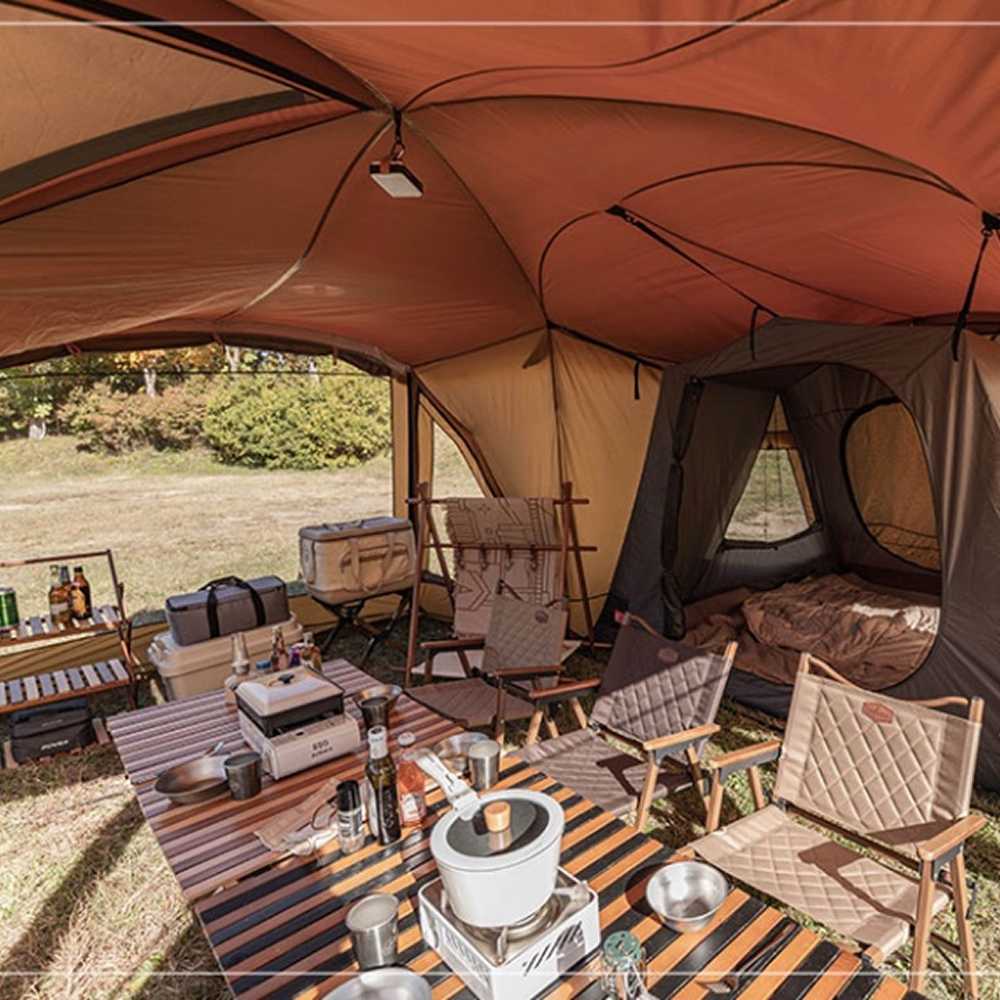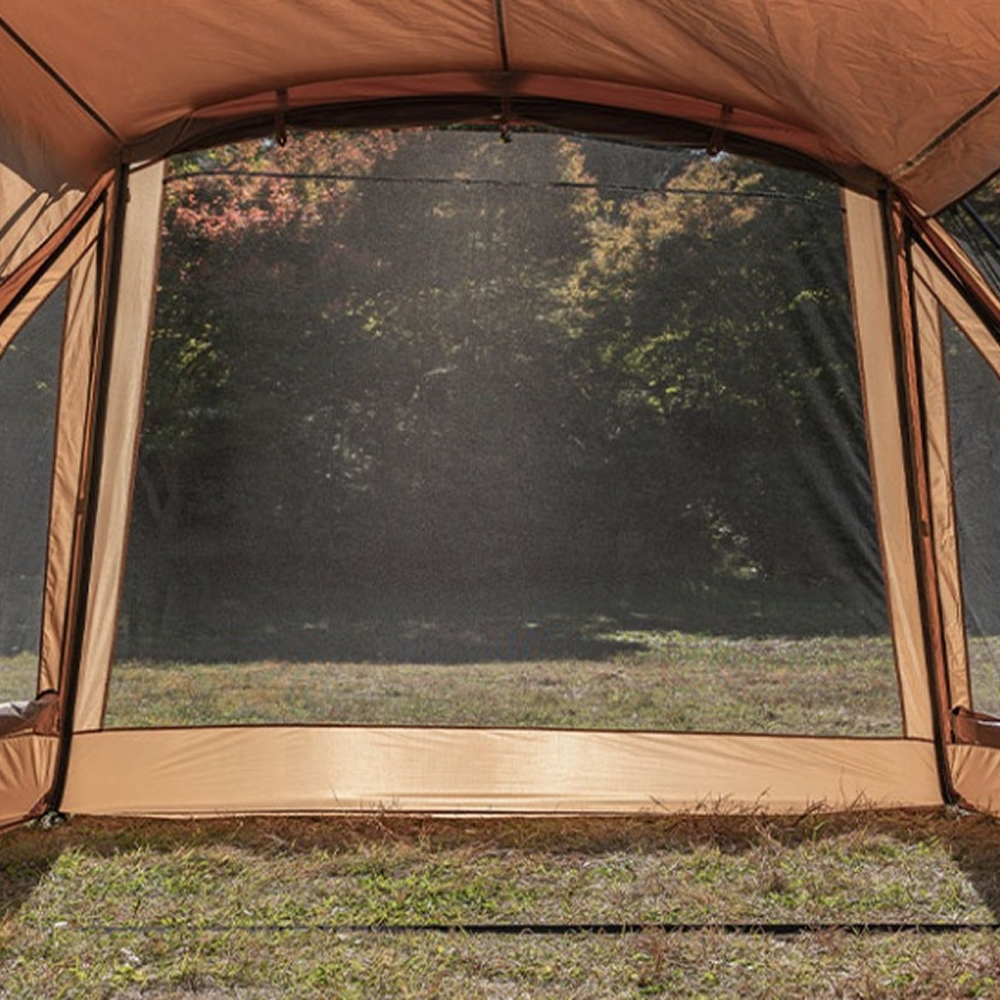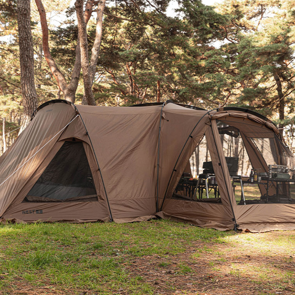 The Nest T is a versatile tent defined by its innovative T-shape structure that maximizes usable space, featuring panoramic mesh ventilation and four large doors for unmatched openness and airflow.