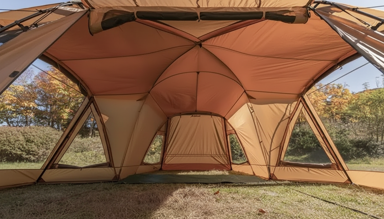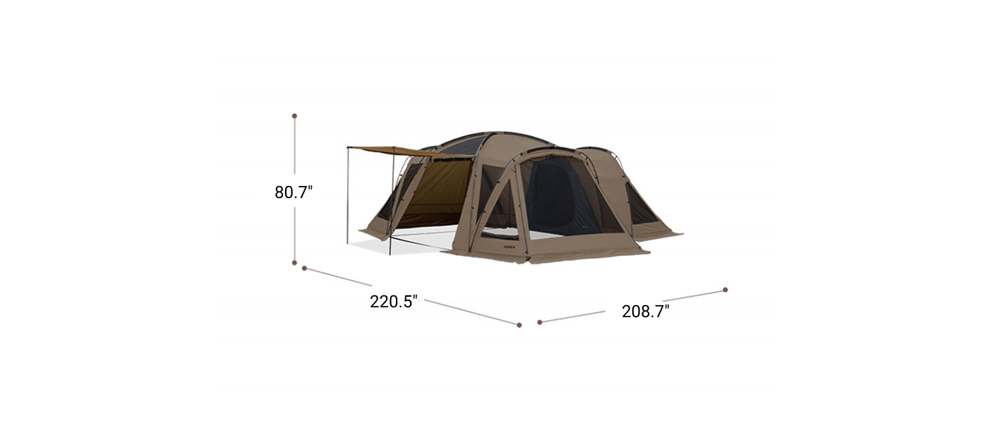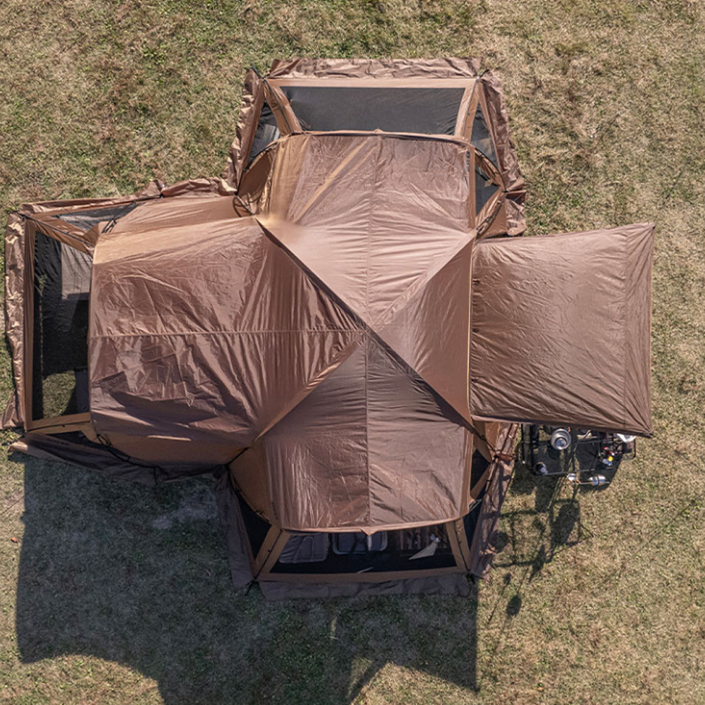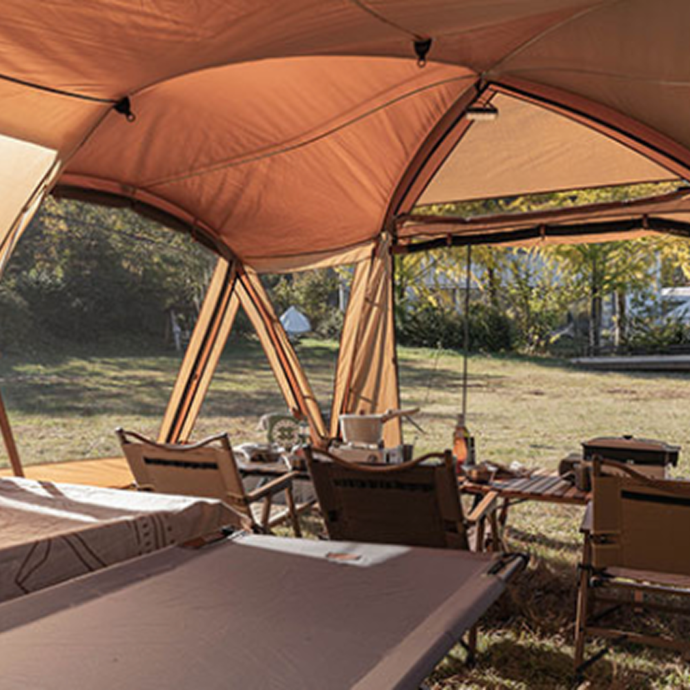 The Nest T is a versatile tent defined by its innovative T-shape structure that maximizes usable space, featuring panoramic mesh ventilation and four large doors for unmatched openness and airflow.