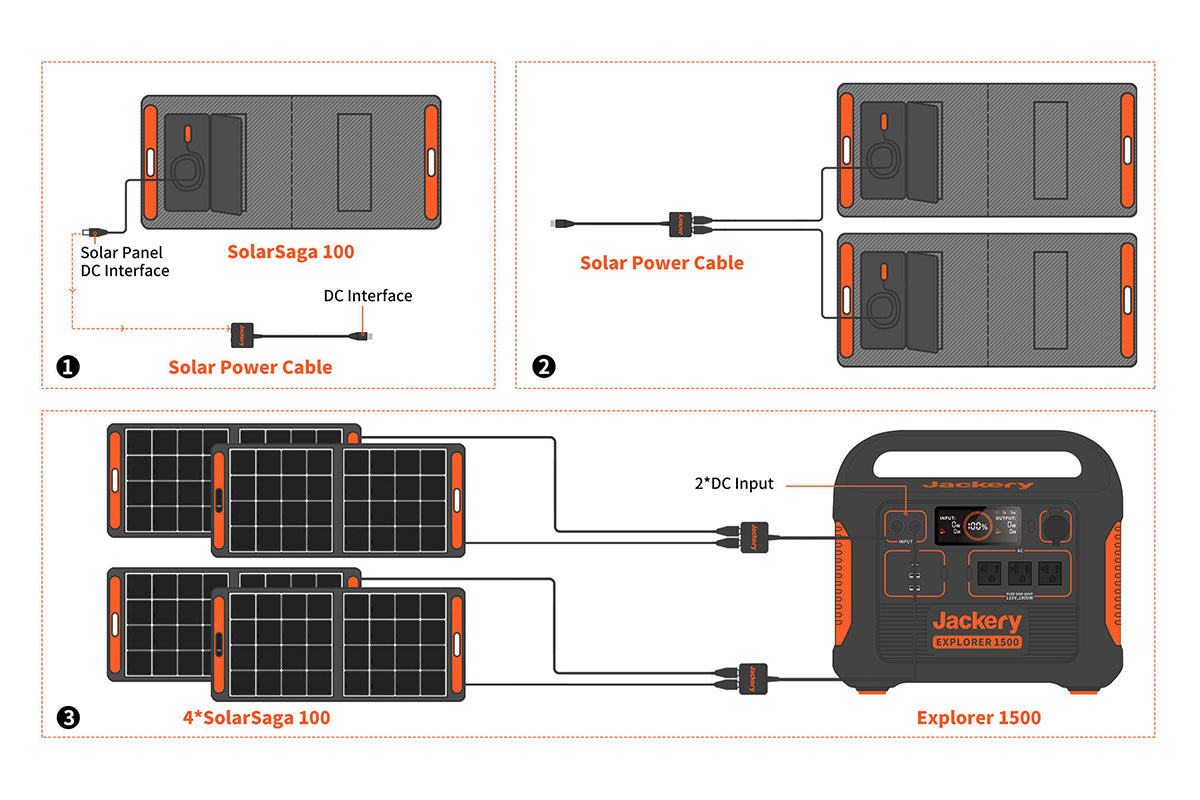 Four SolarSaga 100W solar panels can quickly charge the Explorer 1500 (not included)within 4 hours(from 0-80%) by connecting together with two Solar Power Cable (package included).