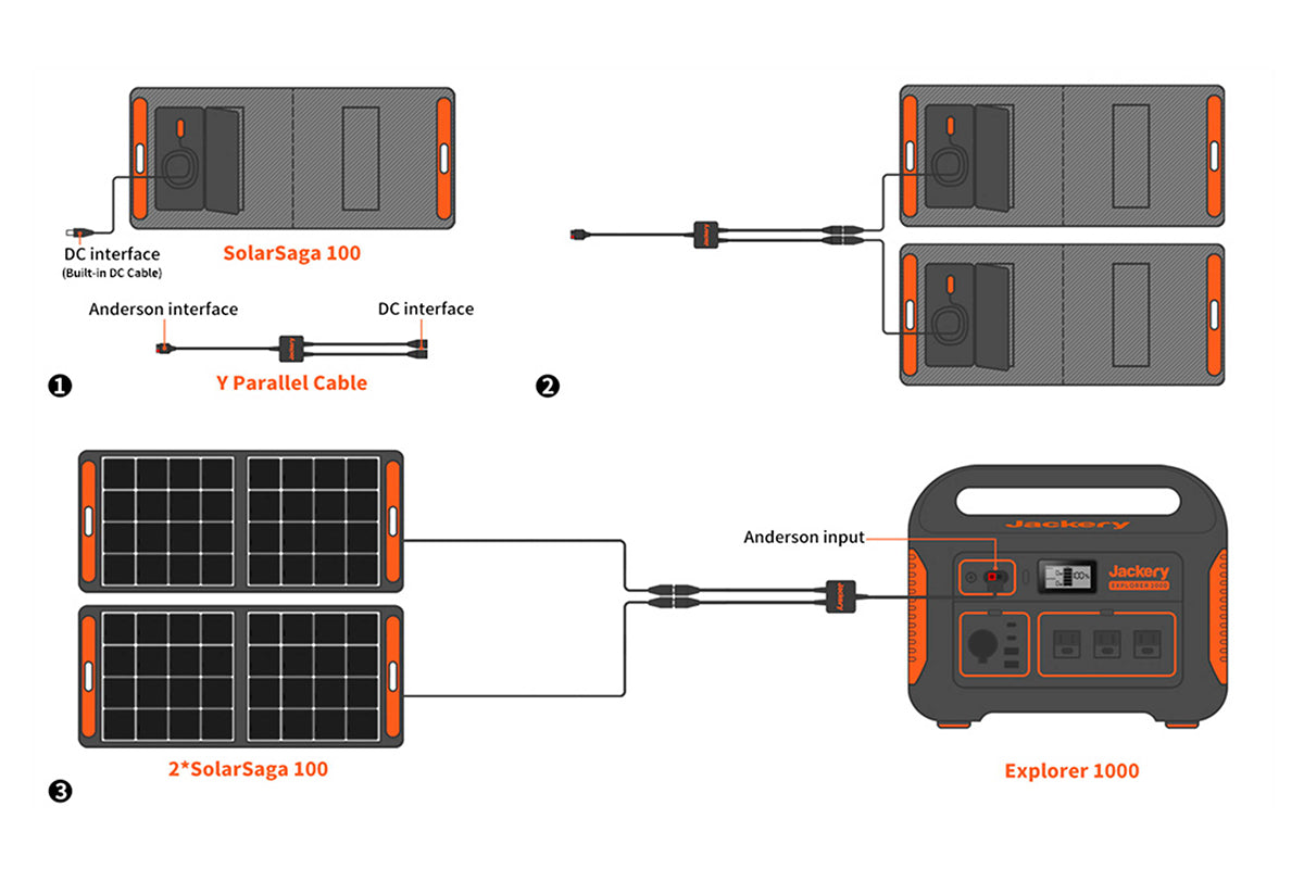 Two SolarSaga 100W solar panels can quickly charge the Explorer 1000 (not included)within 8 hours by connecting together with a SolarSaga Y Parallel Cable (package not included).