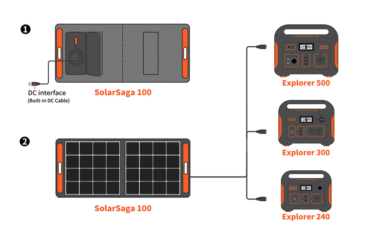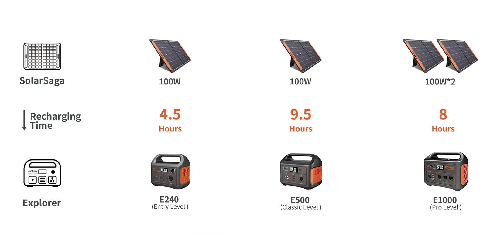 SolarSaga 100W solar panel can quickly charge The Explorer 500/300/240(not included)within 9.5/5/4 hours.