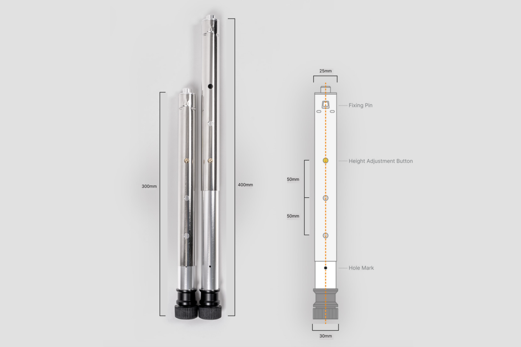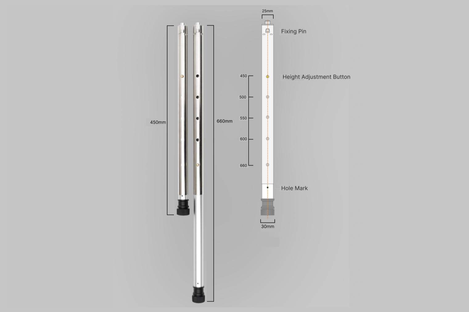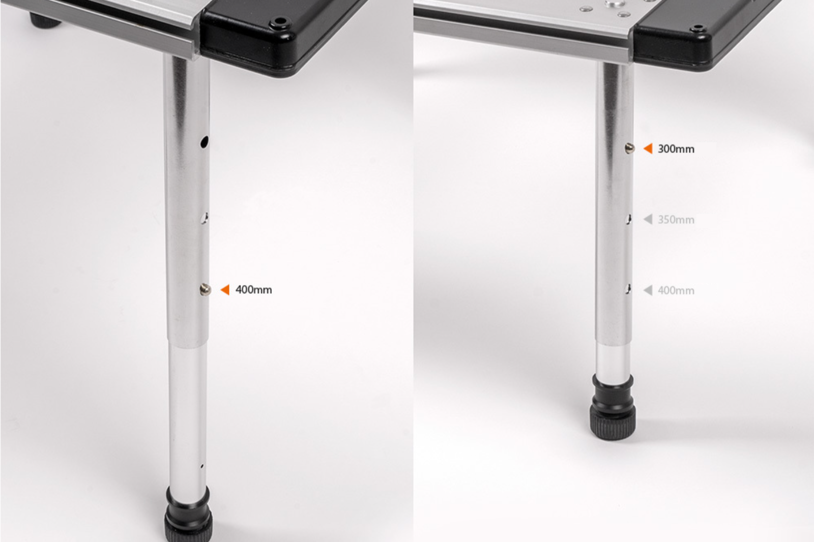 The Stainless Steel Leg is compatible with many popular system tables and adjusts to three heights: 300mm, 350mm, and 400mm(Short Version) and five heights: 450mm, 500mm, 550mm, 600mm and 660mm (Long Version).