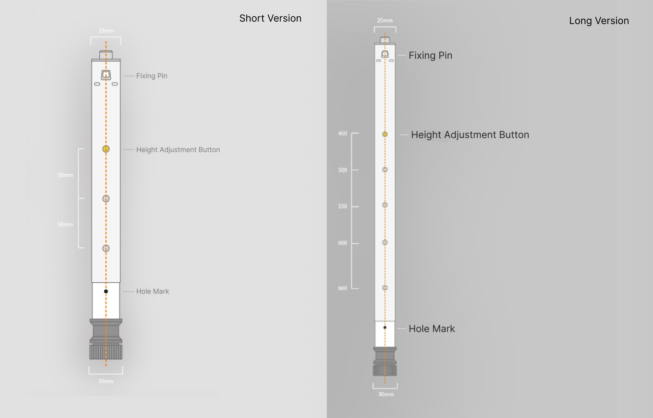 Long (5 Height levels): 1 Level - 450*28mm | 2 Level - 500*28mm | 3 Level - 550*28mm | 4 Level - 600*28mm | 5 Level - 660*28mm