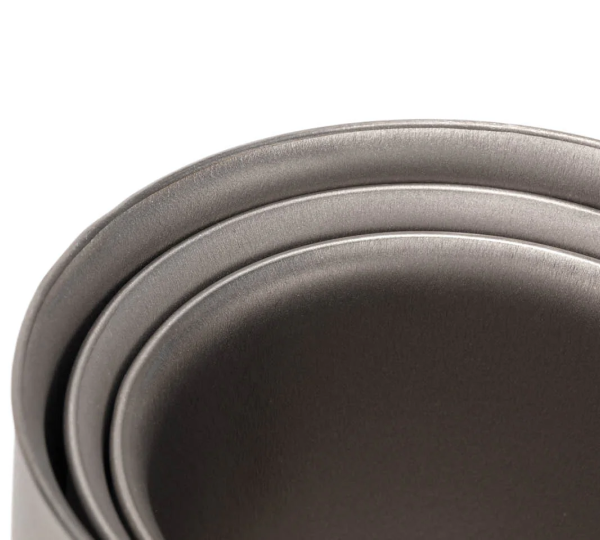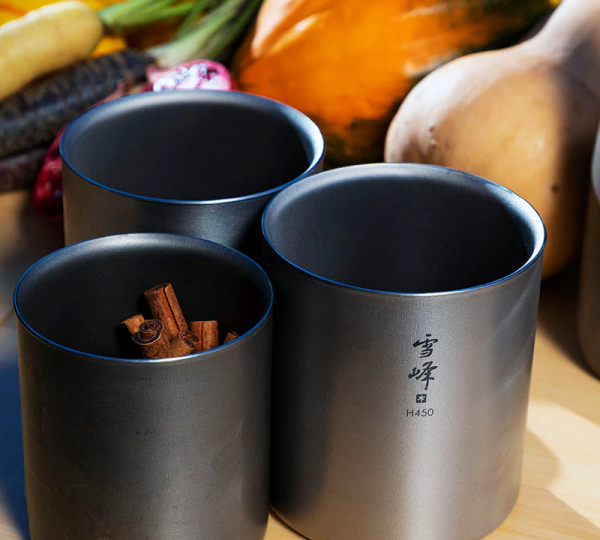 The Ti-Double H Stacking Mugs are crafted from ultra-light Japanese titanium and feature a double-wall construction to insulate both hot and cold beverages. Their clever stacking design allows different capacities to nest together, making storage compact and efficient.