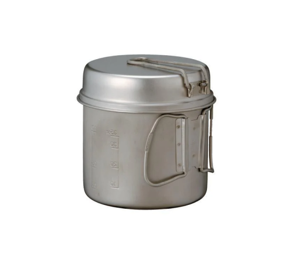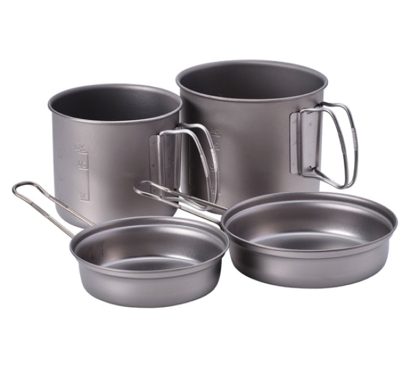 This cookset is made from ultralight Japanese titanium and includes four nested pieces for efficient outdoor cooking. It is designed to be compact for pack-friendly transport and reliable for back-country or campsite use.