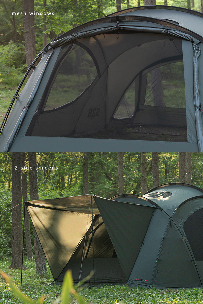 A black pigment-coated roof offers UV protection and shade, while mesh windows and side screens provide ventilation and privacy for a premium camping experience.
