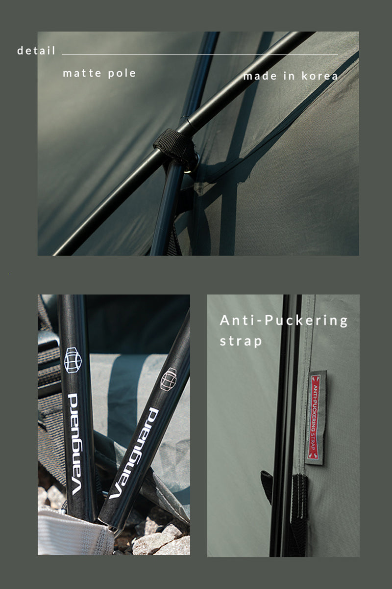 • Poles : Center Pole – Aluminum Ø19/ Front/Rear/Side Poles – Aluminum Ø16/ Inner & Inner Ridge Poles – Aluminum Ø14.5/ Canopy Poles – Aluminum Ø16