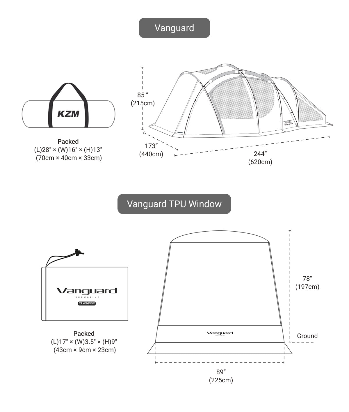 • Inner Tent : (L)138″ (100) × (W)95″ × (H)69″ (350(255)cm × 240cm × 175cm)