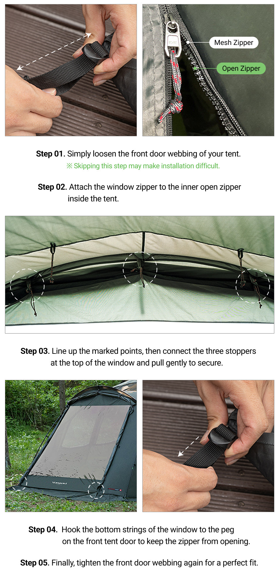 • If the peg-down angle of the front tent door is too wide, installation of the Window may be challenging.