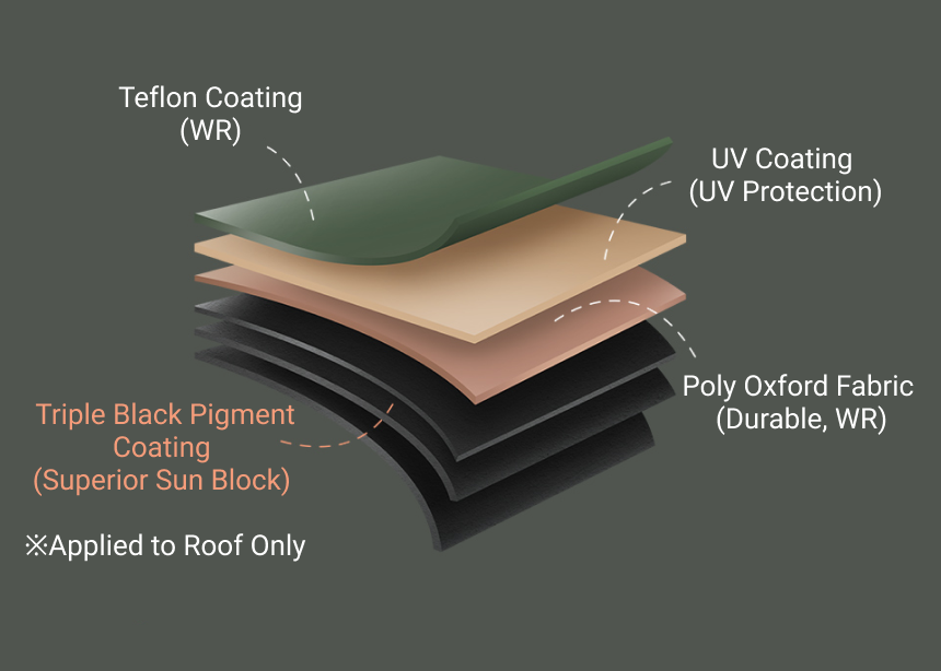 The triple-layer coating delivers enhanced shade, UV protection, and water resistance. It keeps your shelter cooler, safer, and more durable in the outdoors.