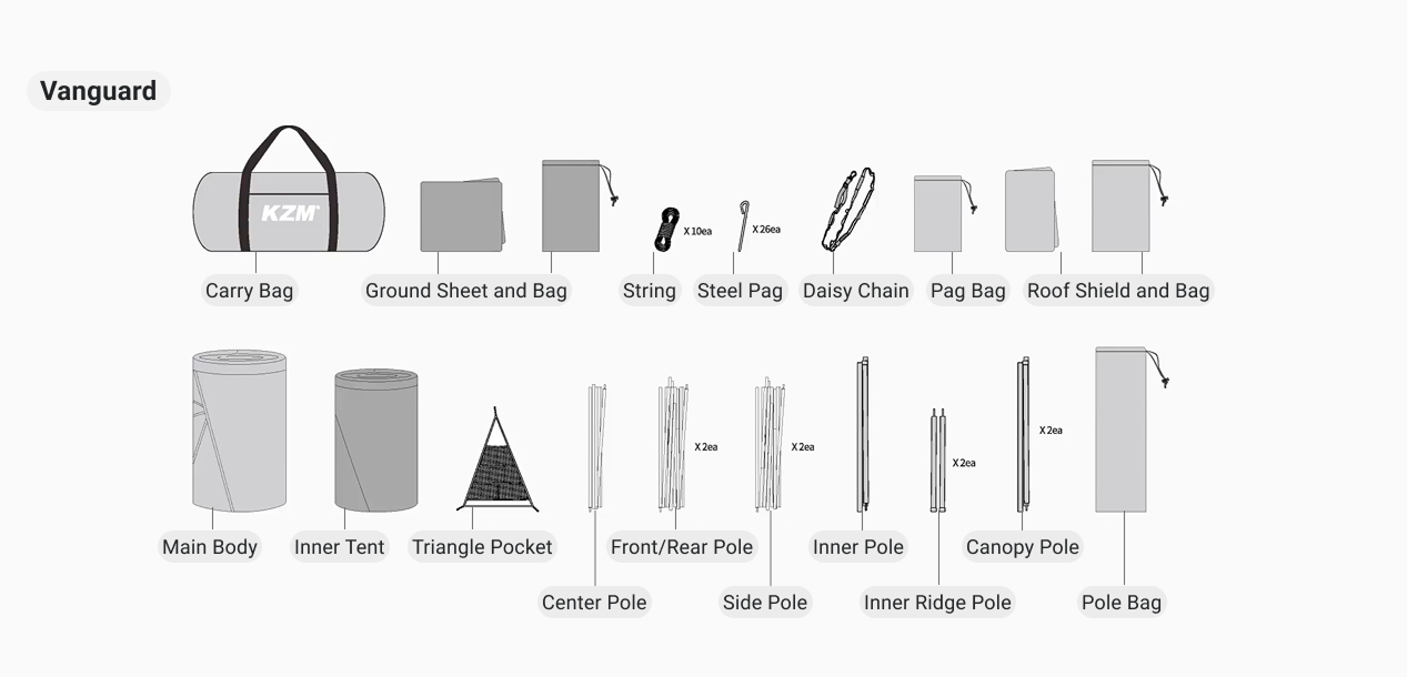 Main Body * 1, Inner Tent * 1, Triangle Pocket * 1, Central Pole * 1, Front/Rear Pole * 2