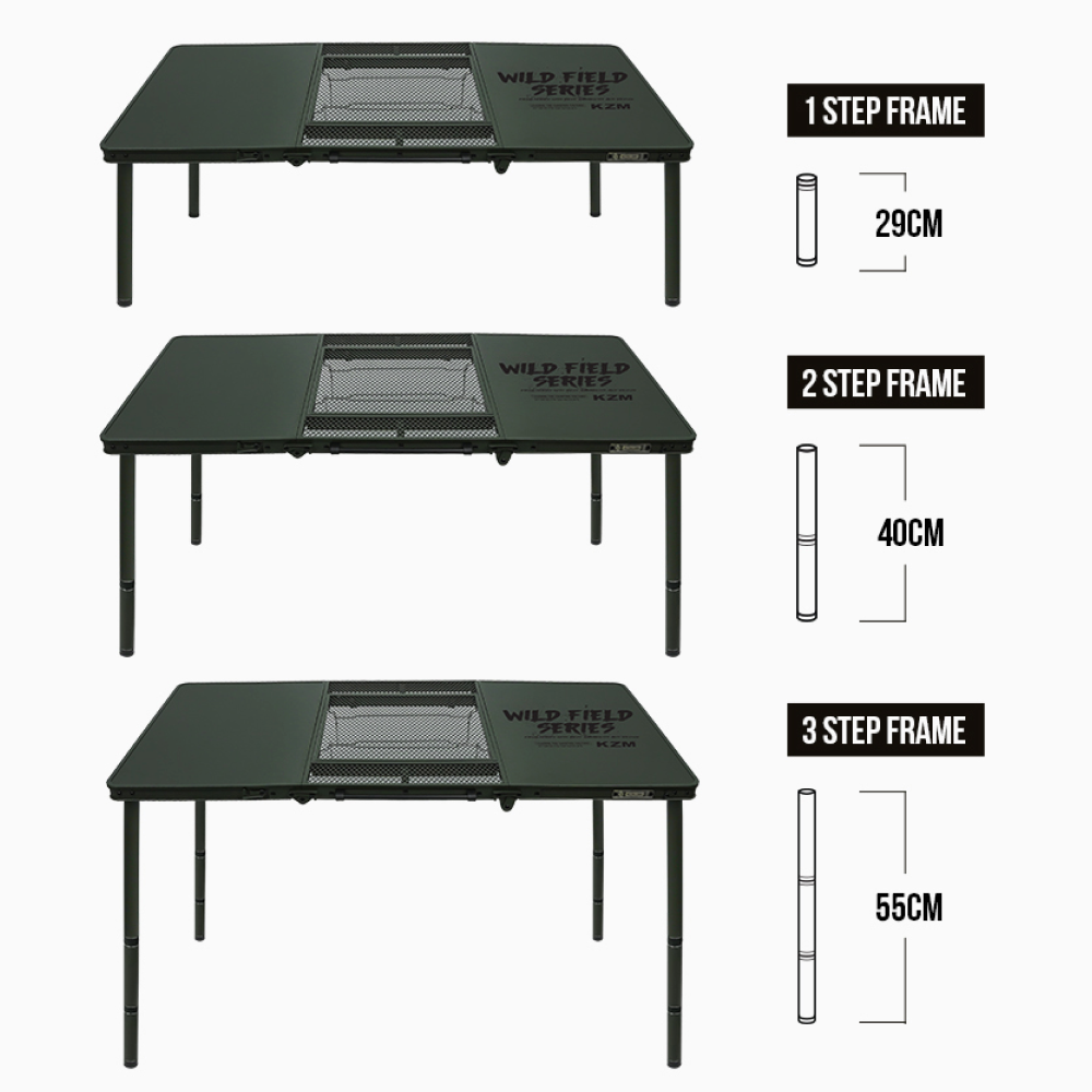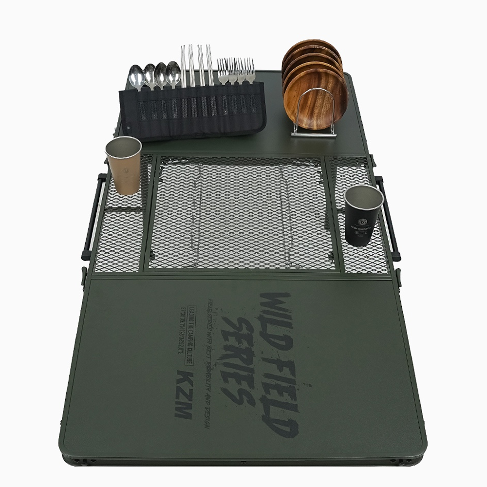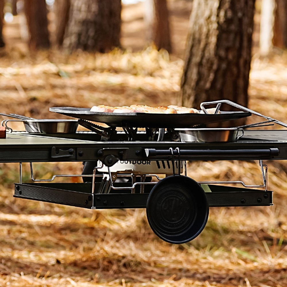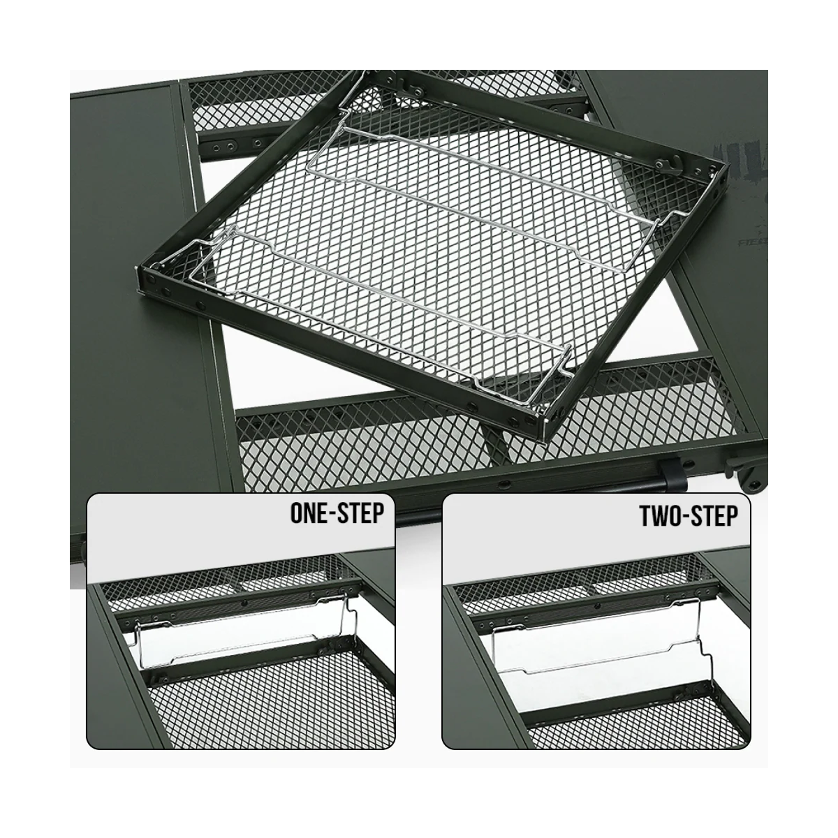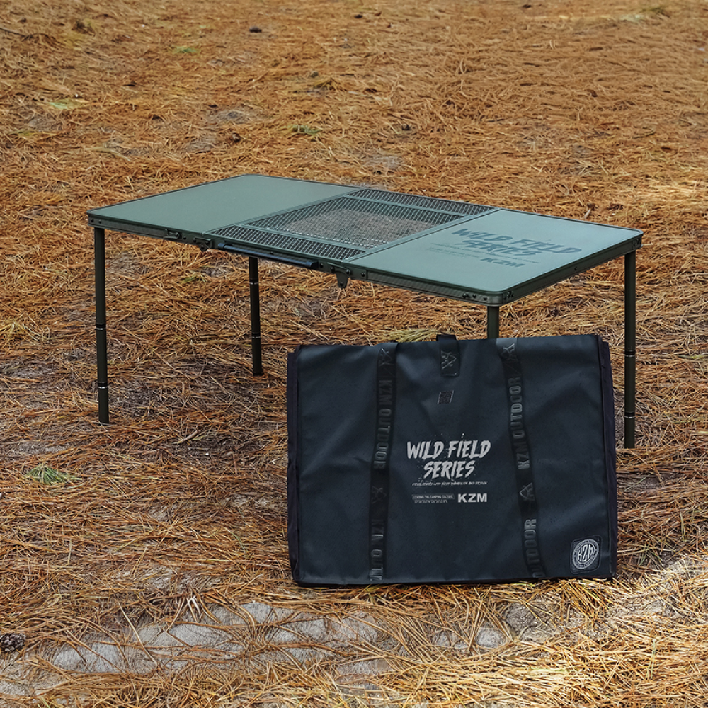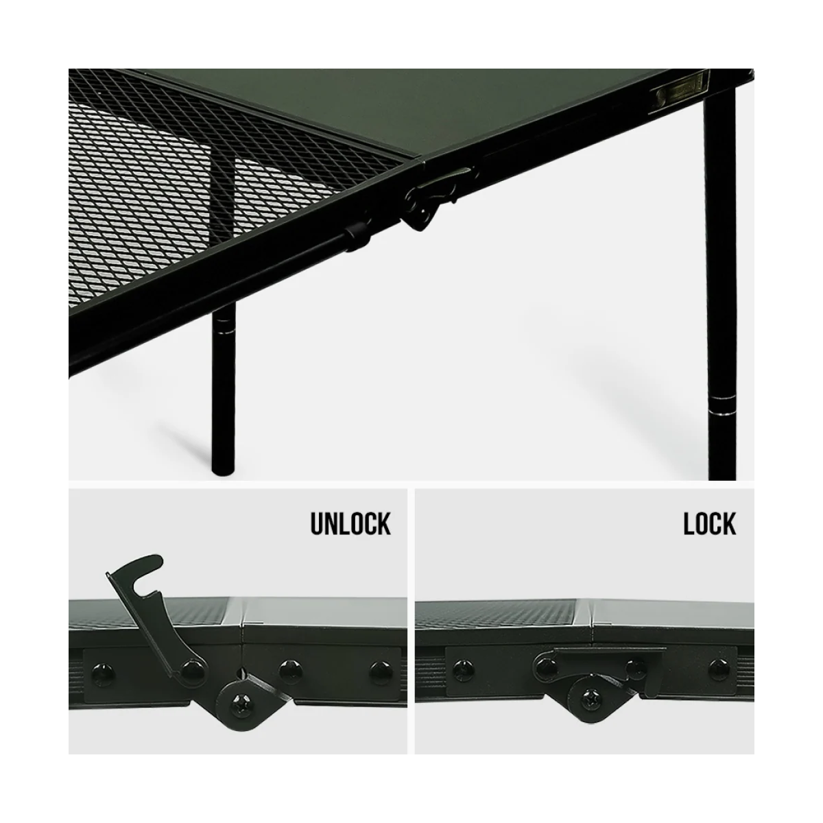 The Wild Field 3 Folding BBQ Table is a versatile, foldable camping table with a sturdy steel mesh, adjustable BBQ plate, wide cooking and dining area, and height-adjustable legs for ultimate convenience.
