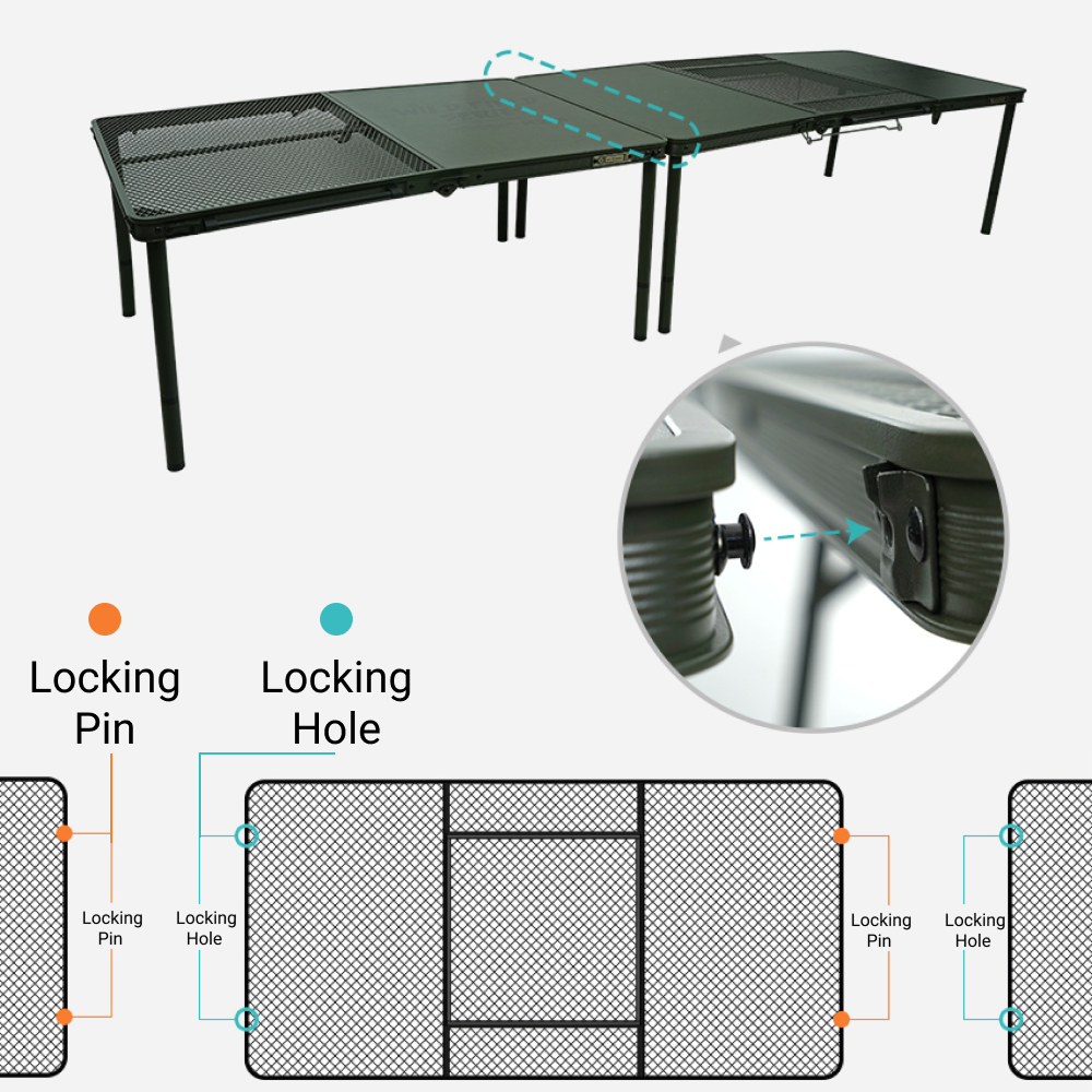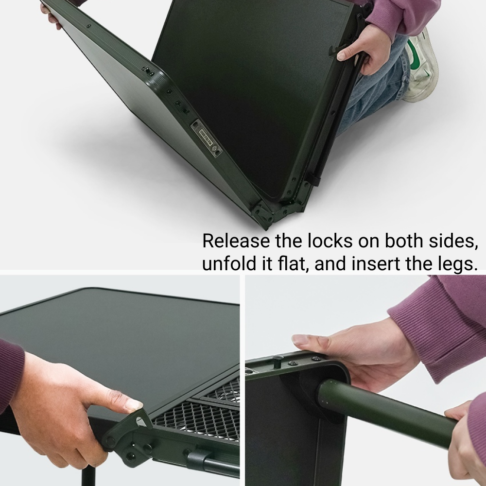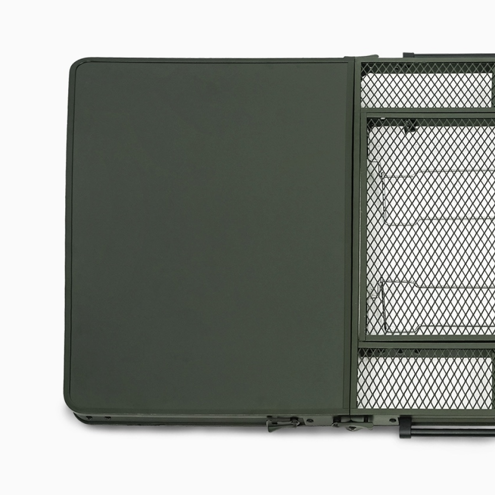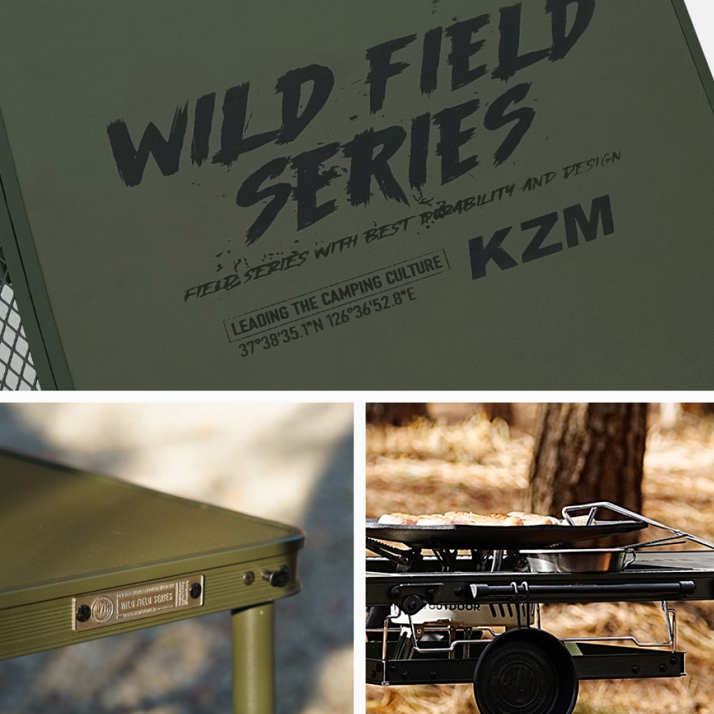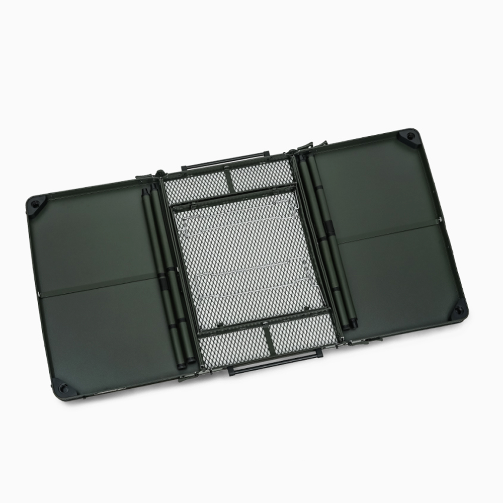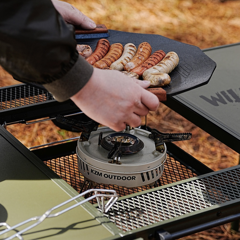 The Wild Field 3 Folding BBQ Table is a versatile, foldable camping table with a sturdy steel mesh, adjustable BBQ plate, wide cooking and dining area, and height-adjustable legs for ultimate convenience.