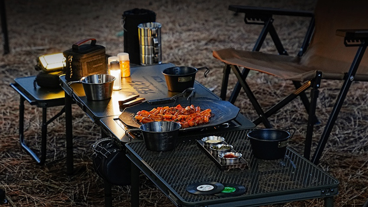 The Iron Mesh & MDF Table is a durable, lightweight camping table with adjustable height, detachable design, and versatile cooking and hanging options, combining rugged style with practical functionality.